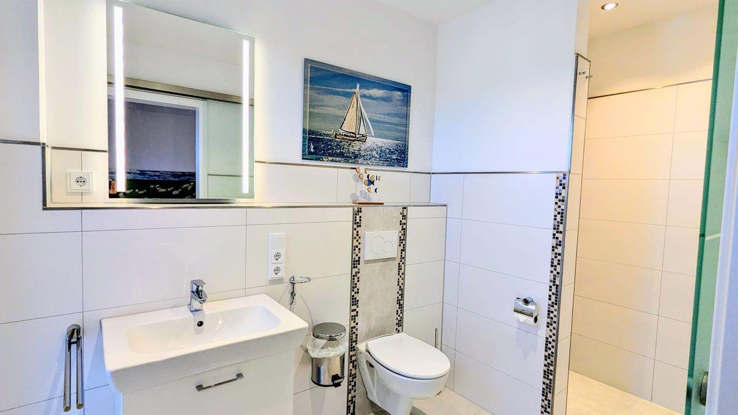 Weiterhin verfügt das Apartment über ein modernes Badezimmer mit bodengleich begehbarer Dusche, Waschbecken und WC. Für zusätzlichen Komfort sorgen ein Haartrockner sowie ein Waschmaschine in der Unterkunft, damit Sie auch während Ihres Urlaubs stets frisch gekleidet sind.