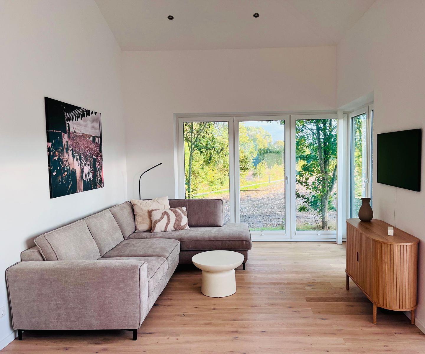 Wohn-Esszimmer: Sofalandschaft mit Schlaffunktion, Couchtisch, Flachbildfernseher (Smart-TV), Empfang deutschsprachiger TV-Programme (SAT-Anlage)