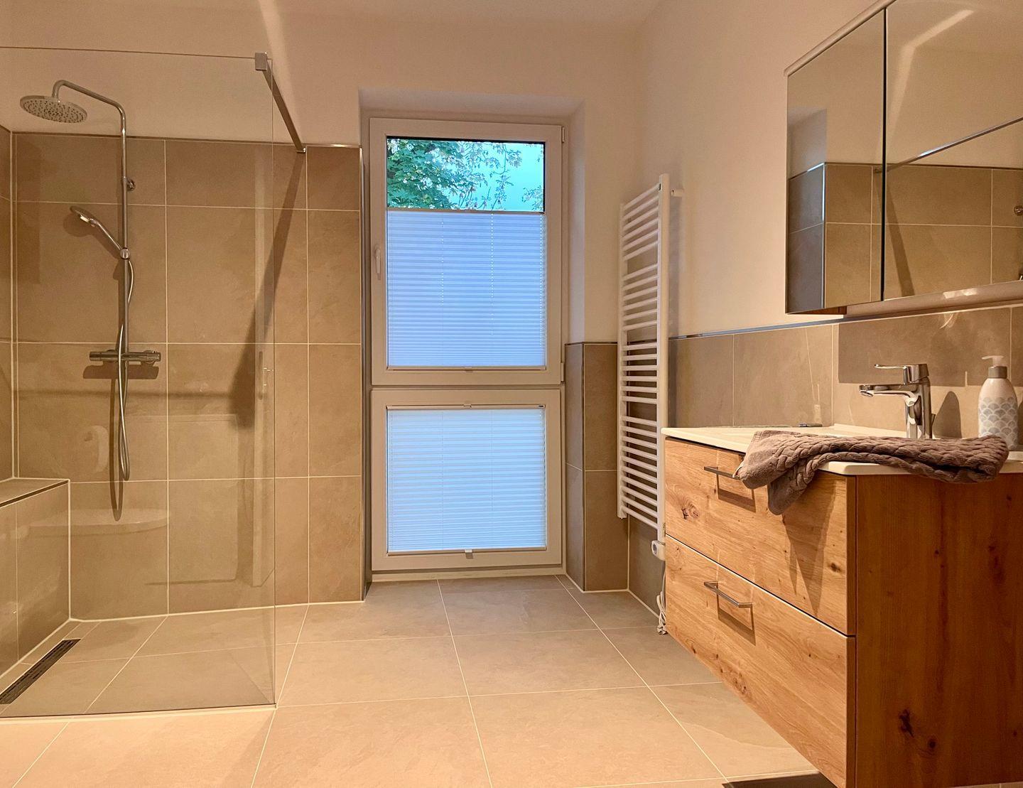 Das moderne Badezimmer überzeugt mit einer bodengleichen Dusche und Tageslicht.