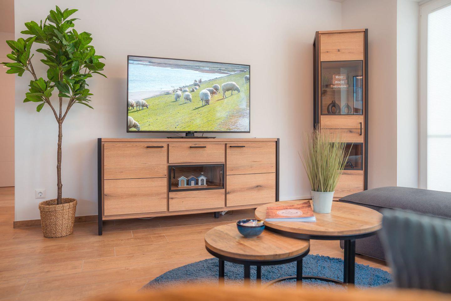 Wohn-Esszimmer: Sofalandschaft, Couchtisch, Flachbildfernseher (Smart-TV), Empfang deutschsprachiger TV-Programme (SAT-Anlage)