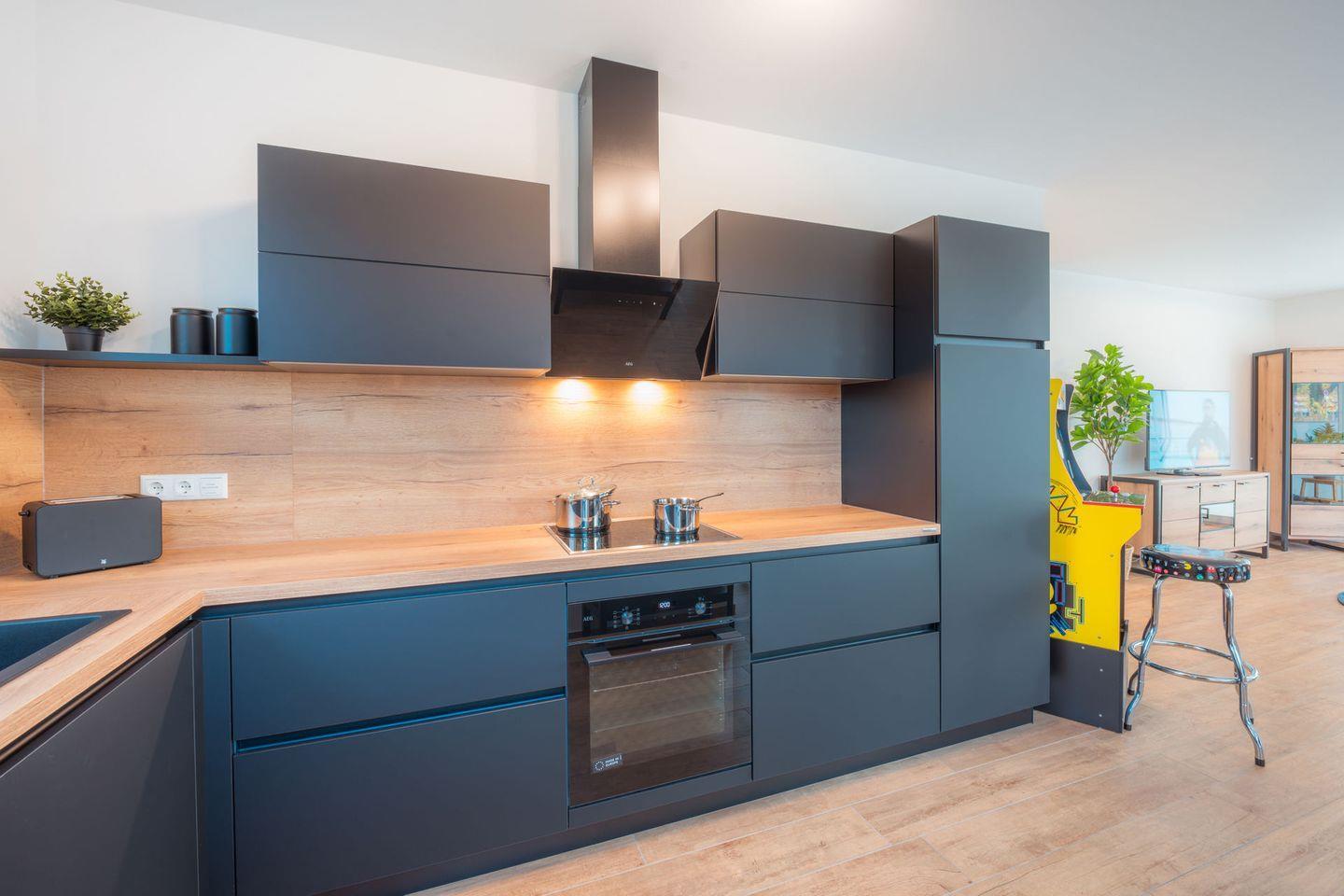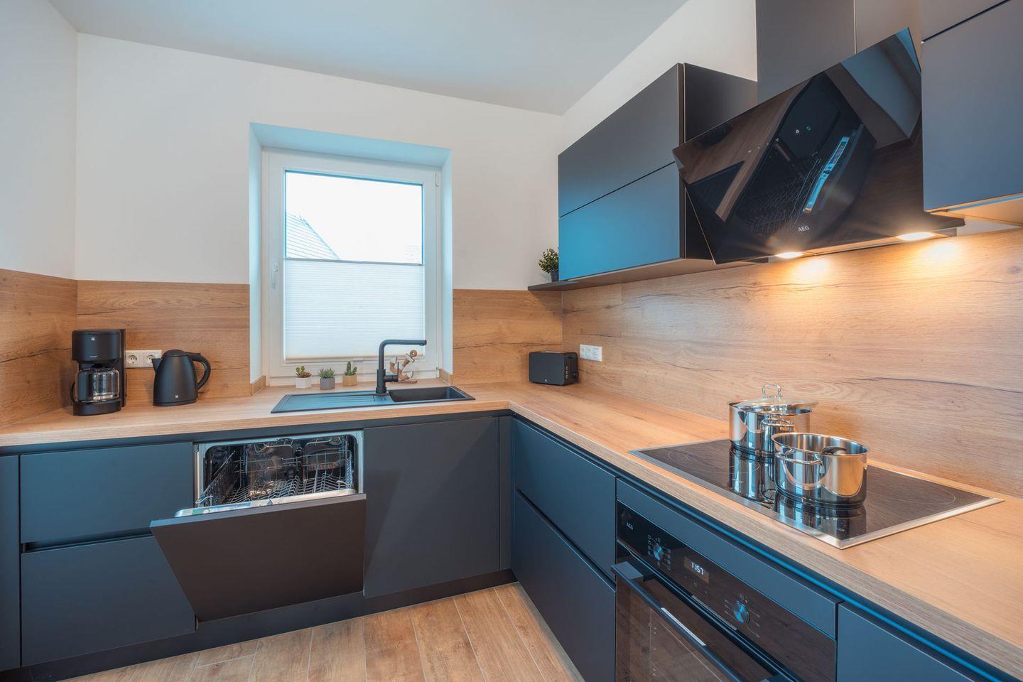 Küche und Haushalt: Einbauküche, Kühlschrank mit Gefrierfach, Ceranherd, Dunstabzugshaube, Backofen, Geschirrspüler, Wasserkocher, hochwertiges Geschirr und Besteck, diverse Küchenutensilien