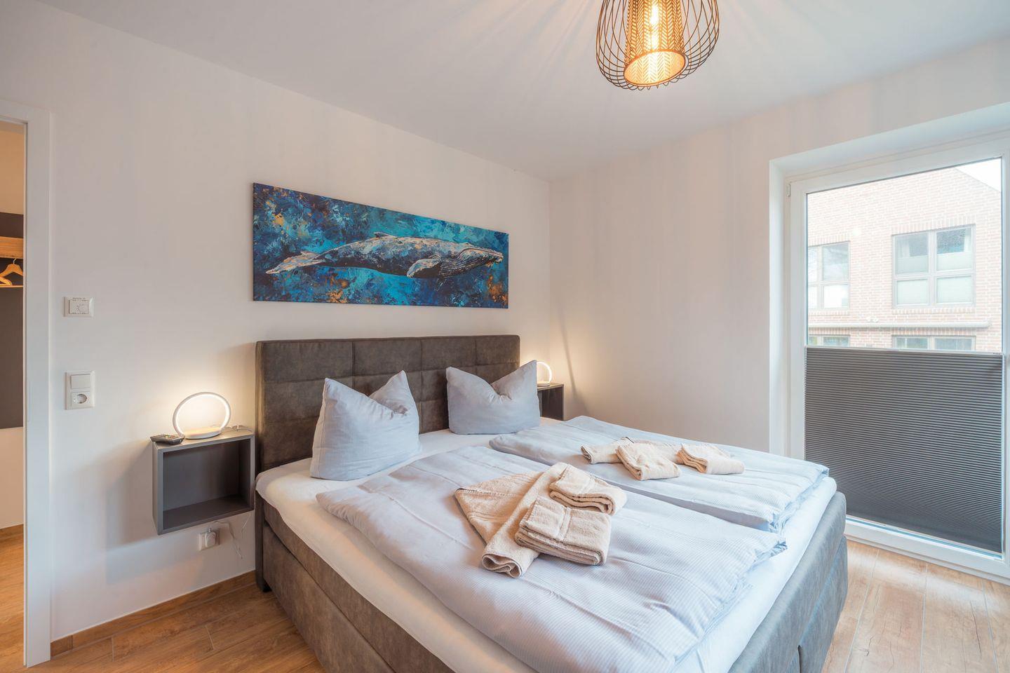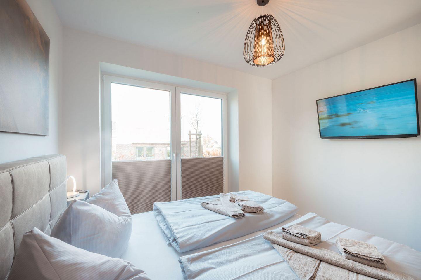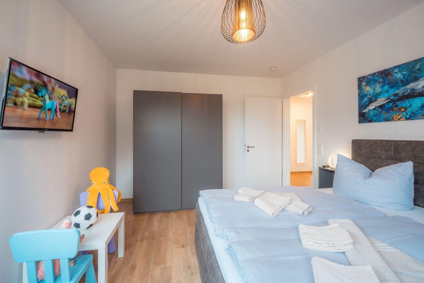 Schlafzimmer 2: Doppelbett (Maße: 180 x 200 cm- durchgängige Matratze), Nachttische, Leselampen, Kleiderschrank, Smart-TV, verdunkelnde Plissees