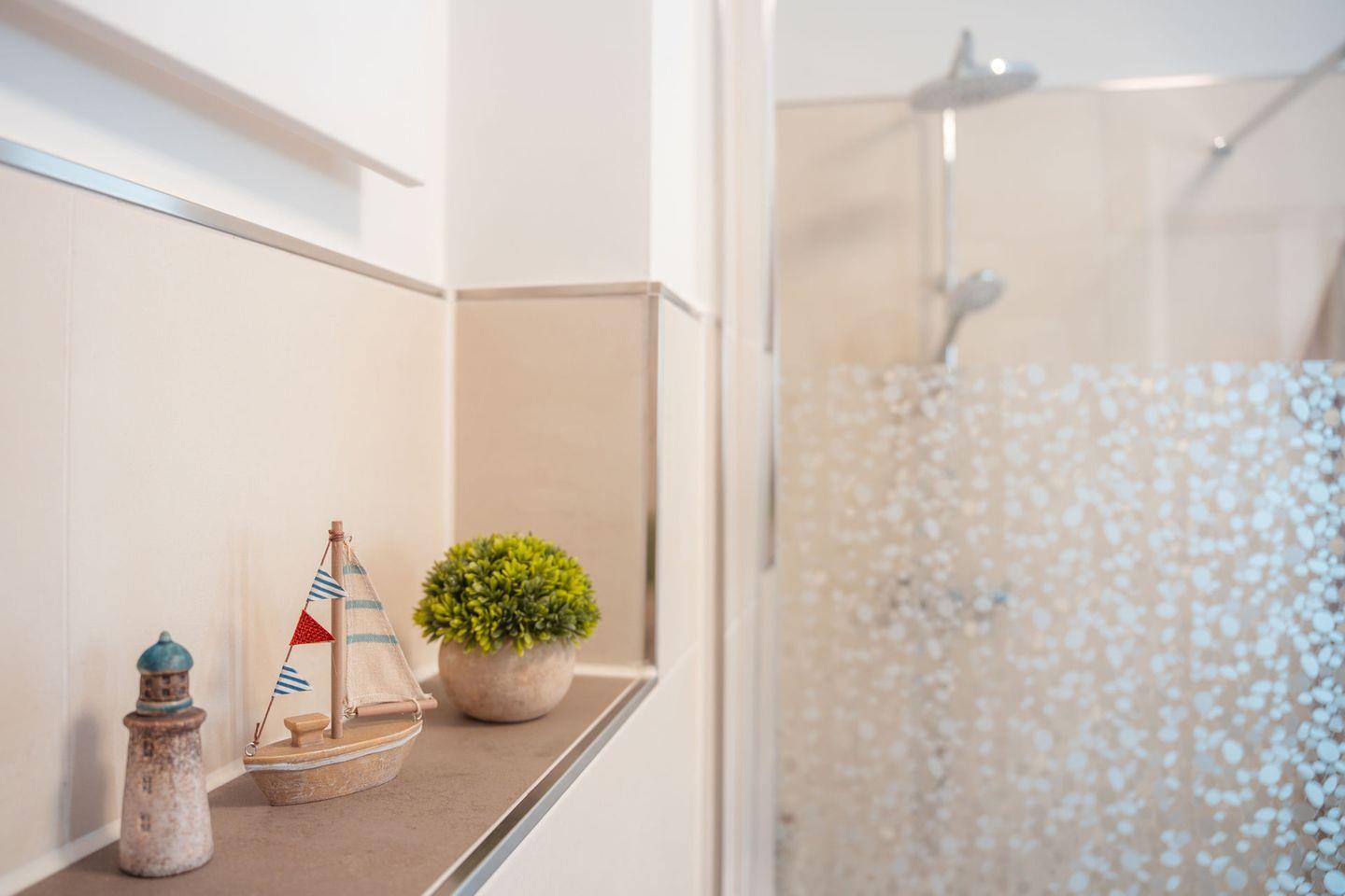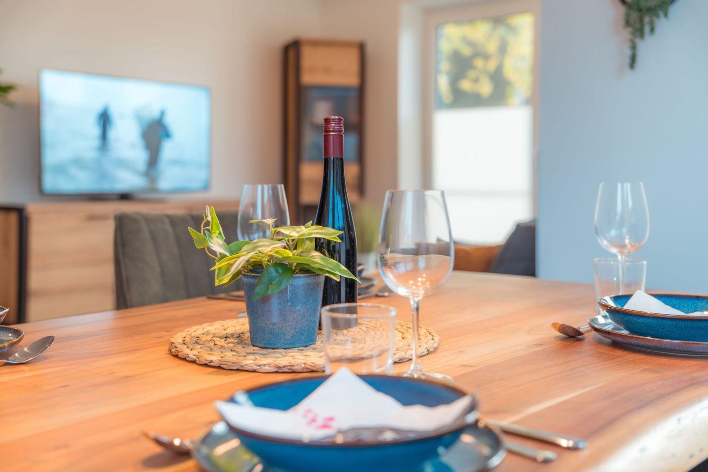 Das Watt'n Wunder verfügt über drei Zimmer, darunter zwei separate Schlafzimmer mit insgesamt vier Schlafmöglichkeiten. Der Bodenbelag aus Fliesen in Wohn- und Schlafzimmern – inkl. Fliegengittern an den Fenstern und Sichtschutz für alle Fenster – gewährleisten ein angenehmes Raumklima und bieten ideale Bedingungen für Allergiker. Die Grundausstattung schließt einen Wohnbereich mit Sofaecke, Essbereich und moderner offener Küche ein, deren Ausstattung auch für anspruchsvolles Kochen bestens geeignet ist: Zur Verfügung stehen Ihnen ein Ceranherd mit Elektrobackofen, Kühlschrank mit Gefrierfach, Spülmaschine, Wasserkocher, Toaster, Kaffeemaschine sowie umfangreiches Geschirr, Besteck und Küchenutensilien. Das Tageslicht-Bad ist mit bodengleicher Dusche, hochwertigem Waschbecken, Spiegel ausgestattet.