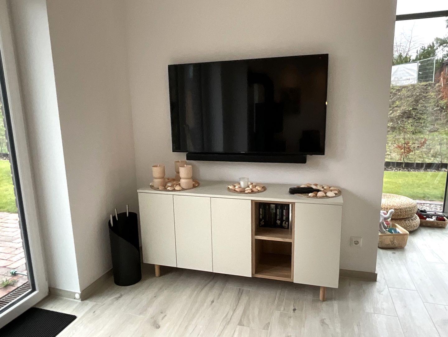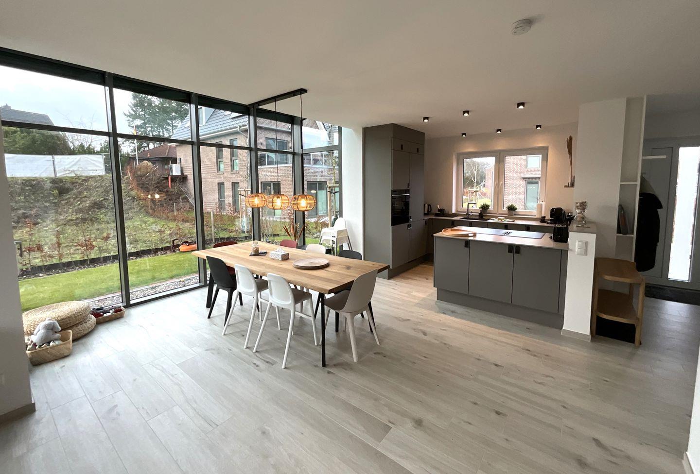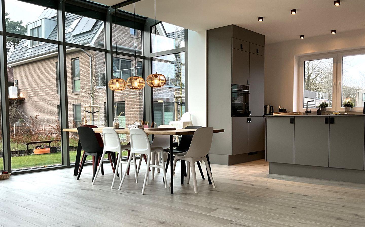 Wohn-Esszimmer: Couch mit gemütlichem Sessel, Flachbildfernseher (Smart TV), Empfang deutschsprachiger TV-Programme (SAT-Anlage), großer Esstisch mit 6 Stühlen als Mittelpunkt im Erdgeschoss, Sichtschutz im Wintergarten