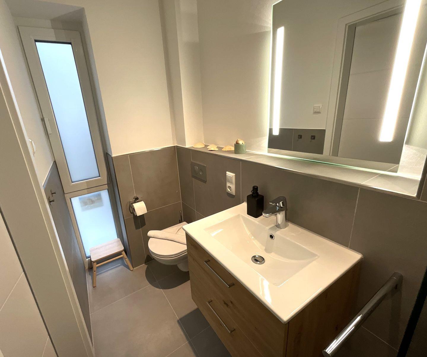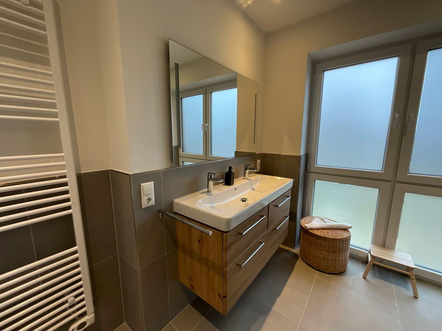 Bad und Sanitär im 1. OG: bodentiefe, barrierefreie Sommerregendusche, Badewanne, Waschtischanlage mit Spiegel, WC, Handtuchheizung, Föhn, Handtücher auf Anfrage