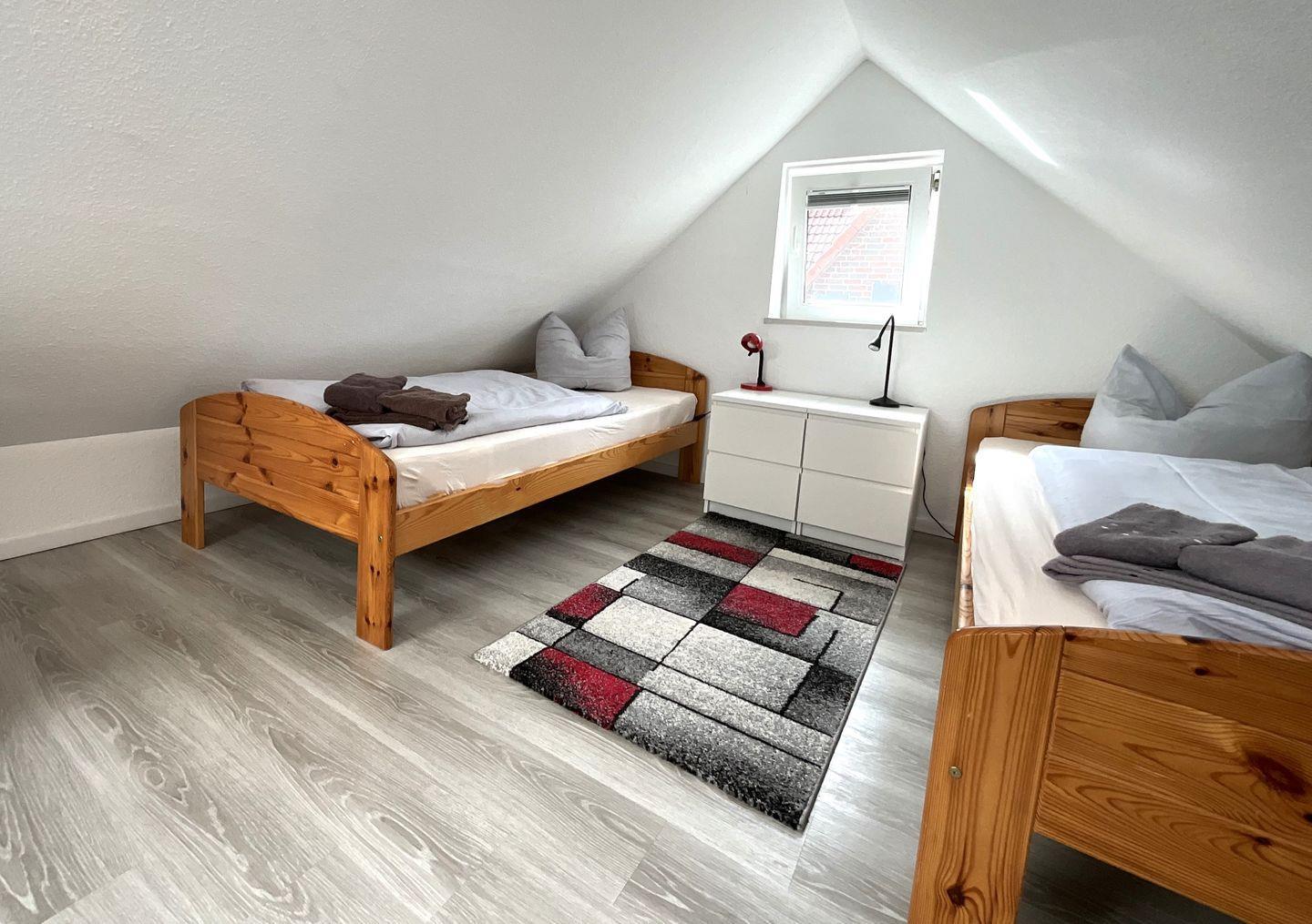 Im gemütlichen Dachstudio befinden sich zwei Einzelbetten und zusätzlich zwei bequeme Sessel zum entspannten Lesen, Platz genug zum Spielen und ein kleiner Fernseher. So nah am Strand und trotzdem können Sie hier einen sehr ruhigen und erholsamen Urlaub verbringen.