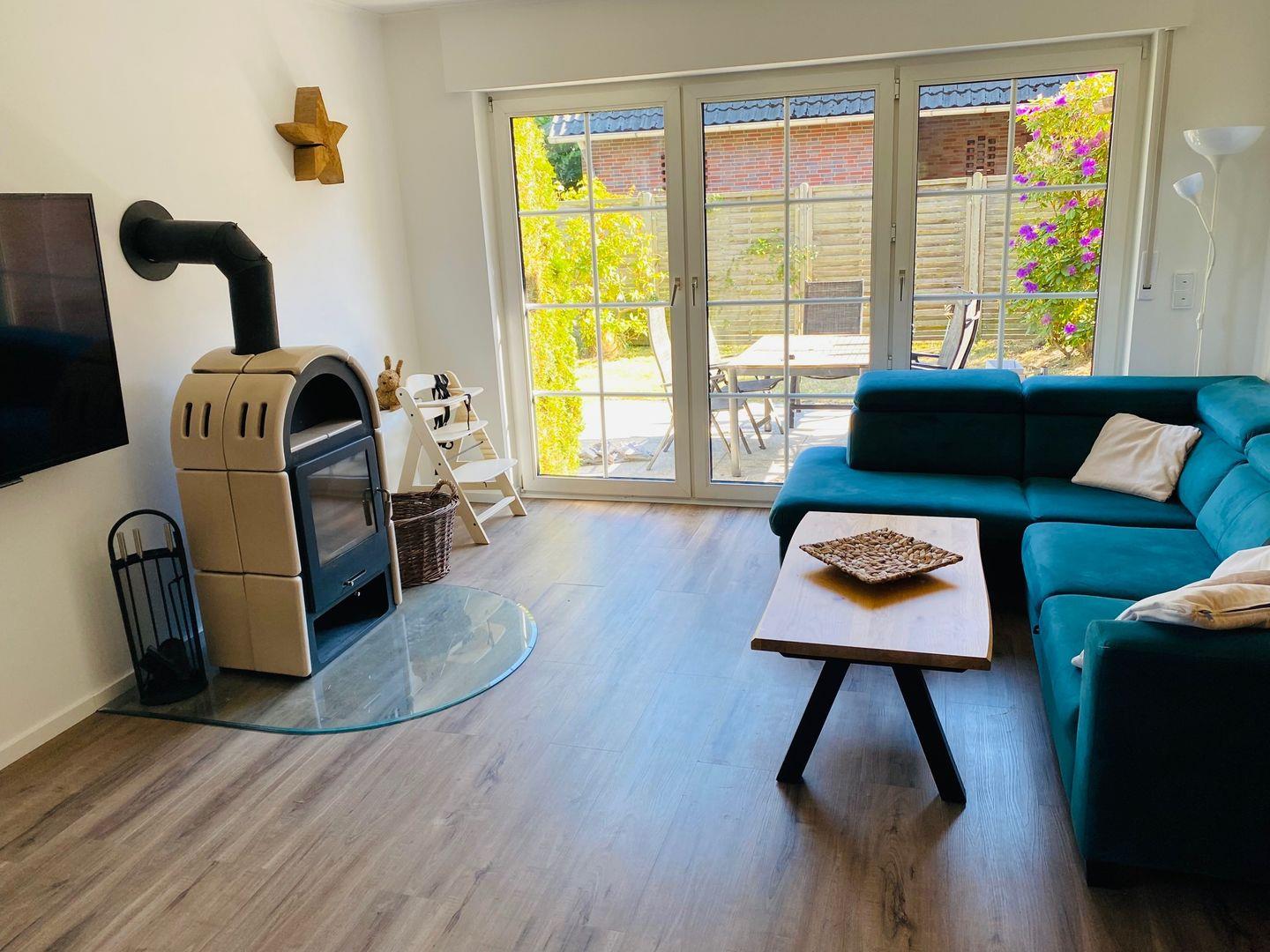 Über die Südterrasse gelangen Sie in das sonnendurchflutete Wohnzimmer mit Kaminofen.