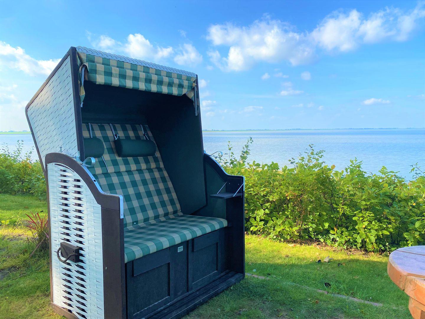 Auf dem gleichen Grundstück - mit direktem Blick auf die Nordsee befindet sich der harmonisch angelegte Park mit seinen Strandkörben, dem Sonnendeck mit Liegen, einer Sandkiste sowie der Gartendusche für die Schlickfüße.