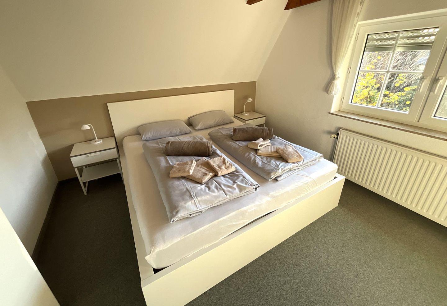 Schlafzimmer 1: 1 Doppelbett (2 Einzelmatratzen à 90x200 cm) , großer Kleiderschrank, Nachtische + Nachtischlampen, Verdunkelung durch Rolläden