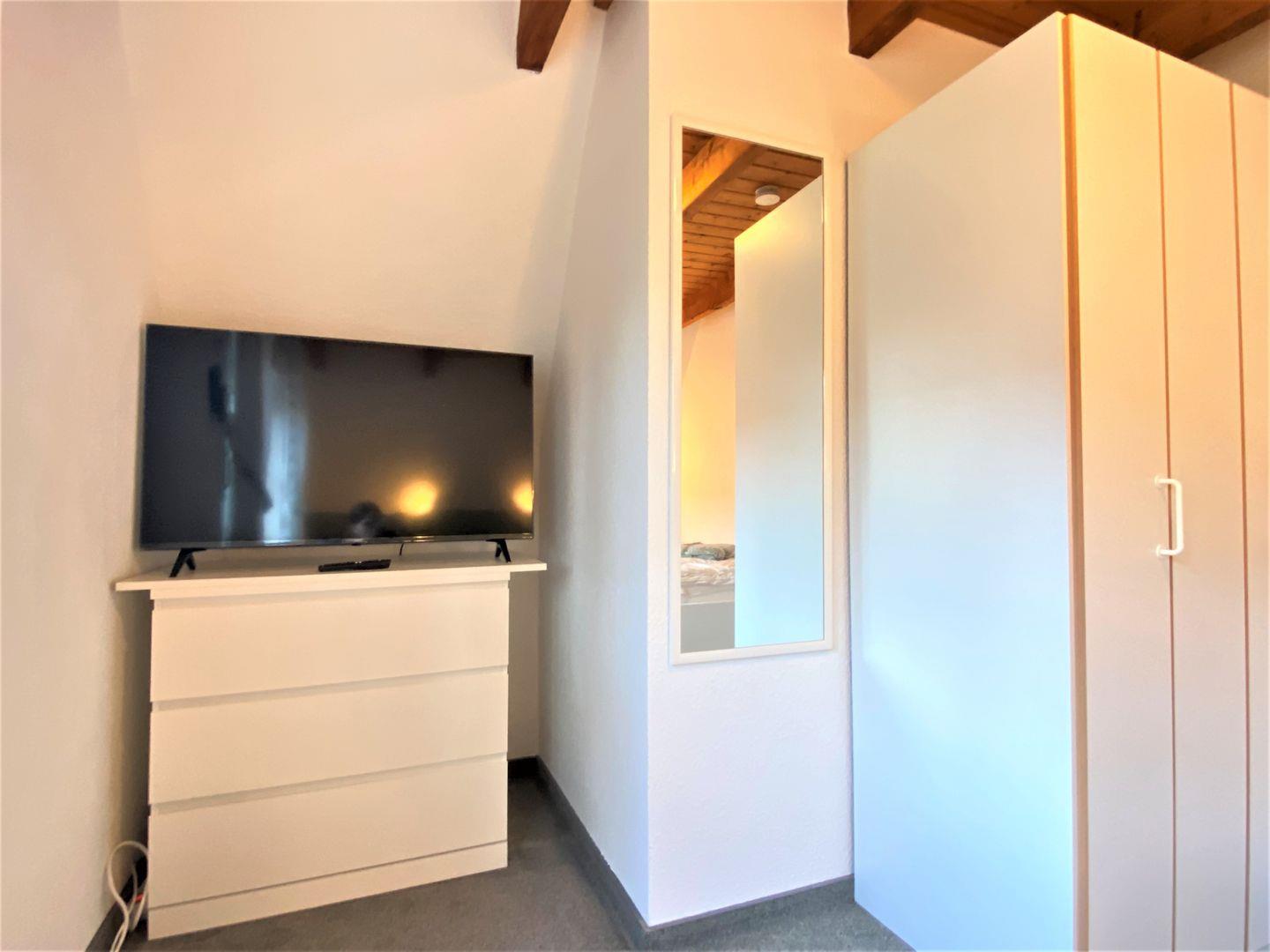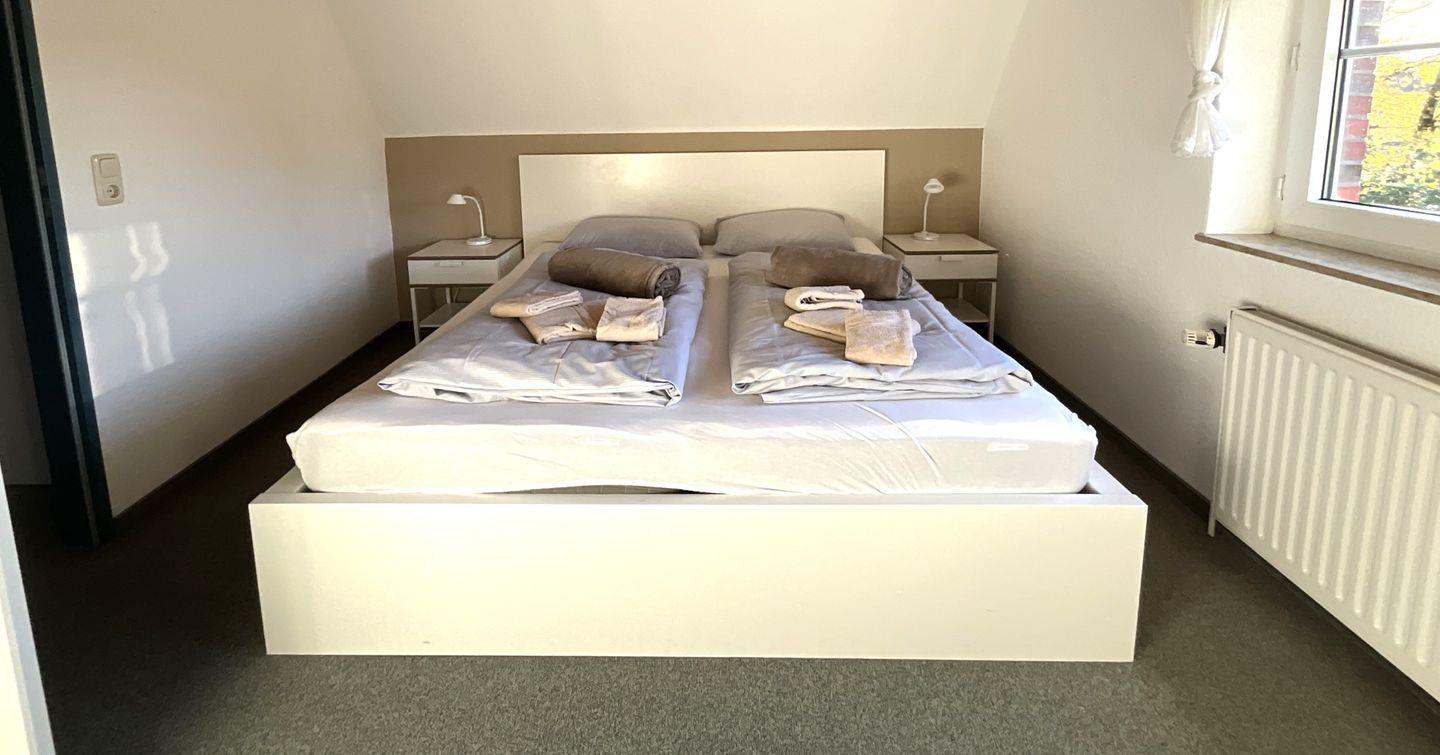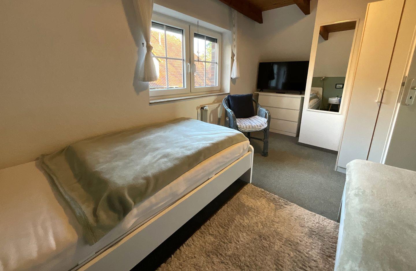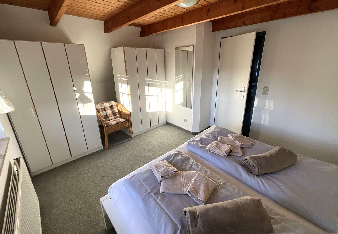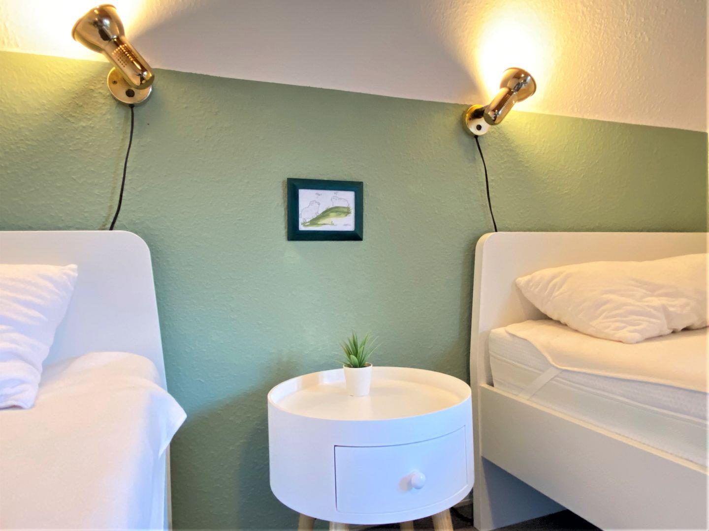 Schlafzimmer 2: 2 Einzelbetten (je 90x200 cm), großer Kleiderschrank, Nachtische + Nachtischlampen, Verdunkelung durch Rolläden, Fernseher