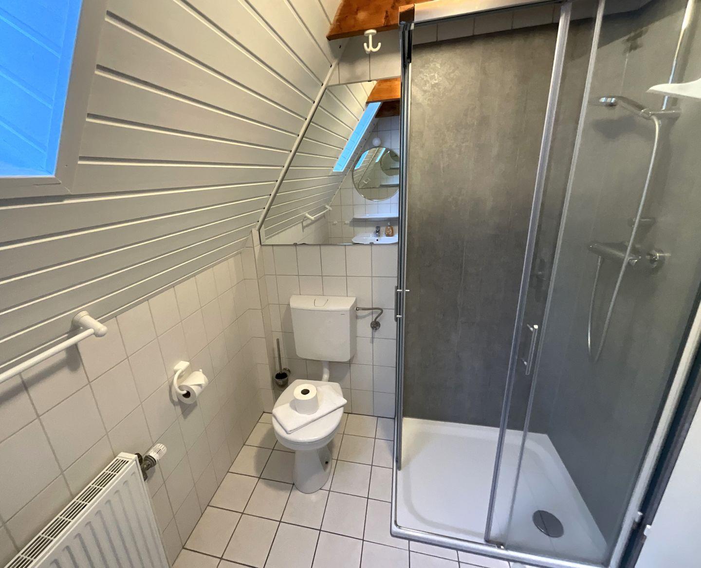 Im Obergeschoss befinden sich das hell-freundliche Elternschlafzimmer mit Doppelbett und großen Kleiderschränken. Gegenüber geht es in das Kinderschlafzimmer mit zwei Einzelbetten und ebenfalls großen Kleiderschränken plus Ganzkörperspiegel. Beide Schlafzimmer sind mit Rollläden ausgestattet. Zwischen den beiden Schlafzimmern befindet sich das komfortable Duschbad mit Dachfenster und hochwertiger Waschmaschine.