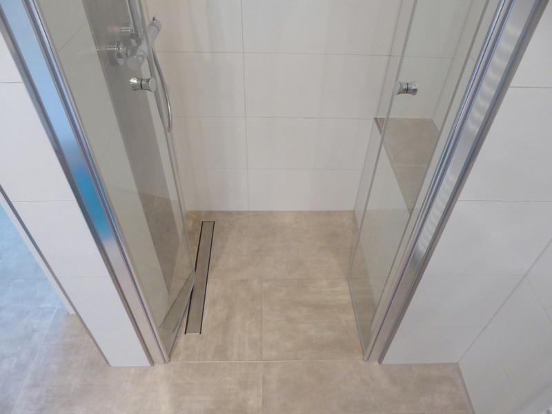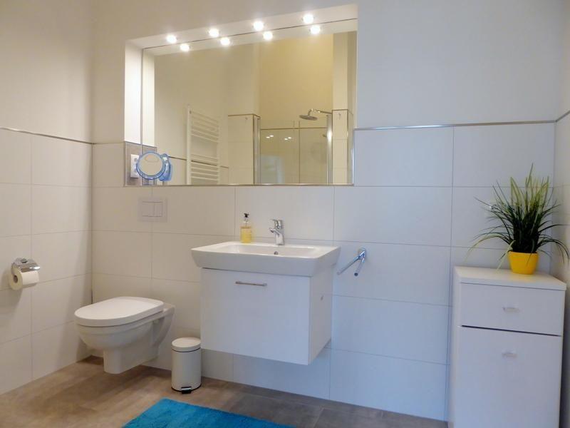 Bad und Sanitär: bodentiefe, barrierefreie Sommerregendusche, Waschtischanlage mit Spiegel, WC, Handtuchheizung, Handtücher auf Anfrage