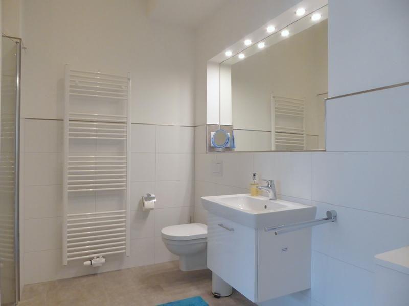 Vom Eingangsbereich rechts gehalten geht es in das schicke Duschbad mit WC. Die große, bodengleiche Dusche, eine Handtuchheizung sowie der große beleuchtete Spiegel als Nische über dem Waschtisch bieten allerhöchsten Komfort. Ein integriertes Badradio rundet das stimmige Gesamtbild ab.