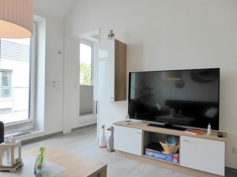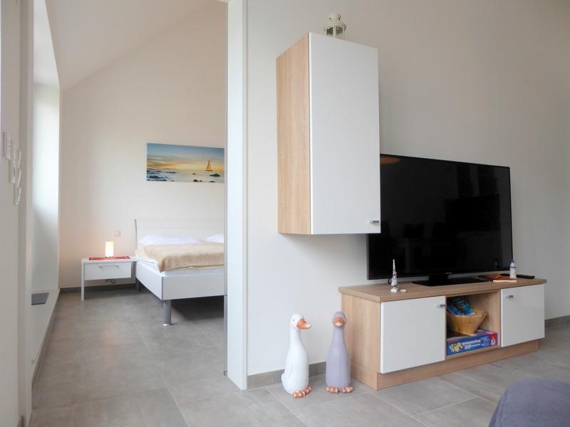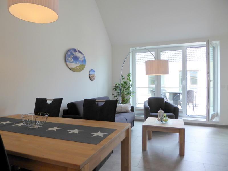 Über die Treppe oder den Aufzug gelangen Sie in Ihr Urlaubsdomizil. Durch den Flur mit moderner Garderobe geht es in den großzügig geschnittenen Wohn- und Essbereich. Der Essbereich mit Massivholzesstisch und Schwingstühlen und die gemütliche Sofaecke machen einen stimmigen Gesamteindruck. Das Ecksofa lässt sich zu einer weiteren Schlafgelegenheit für zwei weitere Personen ausziehen. Für Entertainment ist dank eines modernen Flachbildfernsehers und Wandeinbauradio gesorgt. Praktische Plisseés an den Fenstern lassen sich einfach und schnell zum Sichtschutz nach oben ziehen.