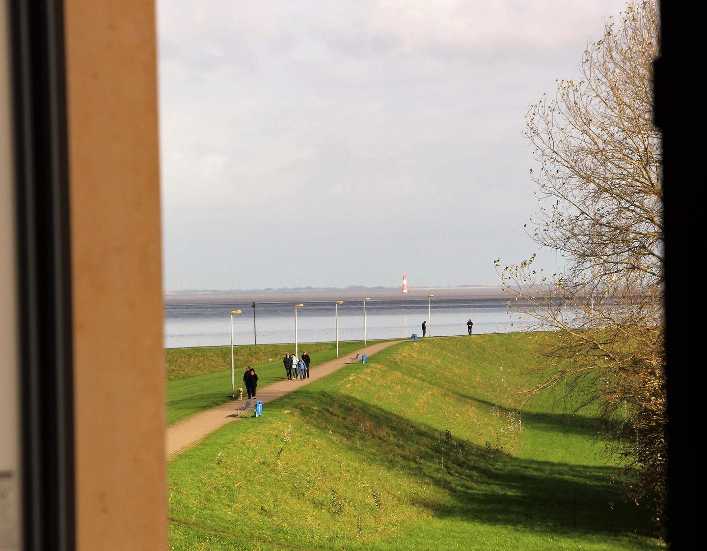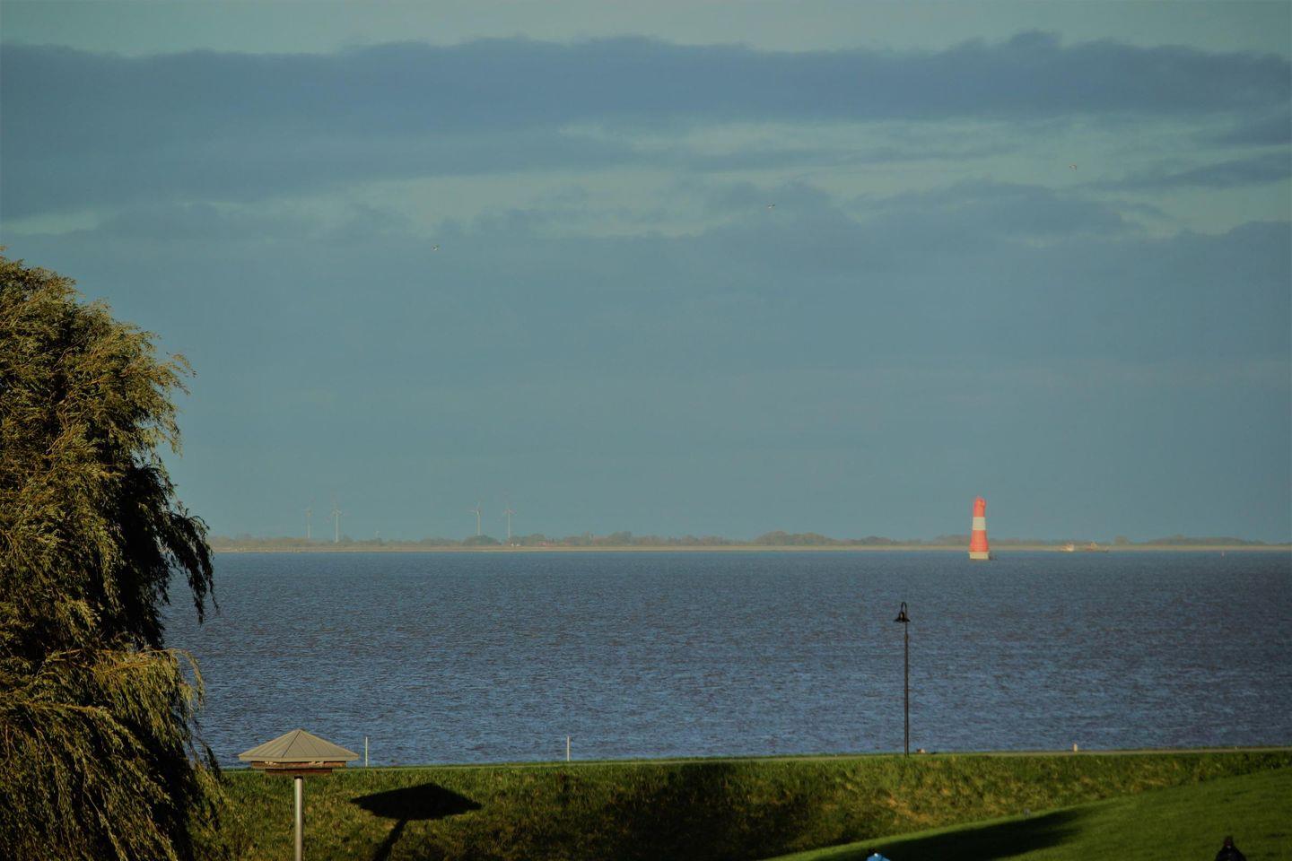 Das Elternschlafzimmer rechts vom Eingang mit großem Doppel-Boxspringbett bietet viel Tageslicht, ist aber dank beschichteter Vorhänge schnell zu verdunkeln. Sogar vom Bett aus hat man einen traumhaften Blick auf den Jadebusen mit dem Leuchtturm Arngast. Ein schicker Kleiderschrank mit ausreichend Stauraum rundet das Angebot im Elternschlafzimmer ab.