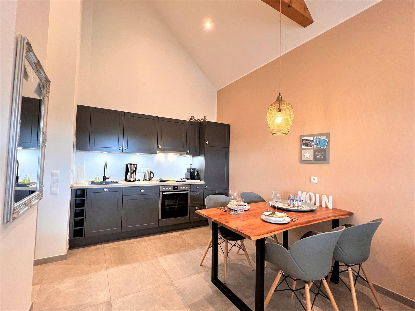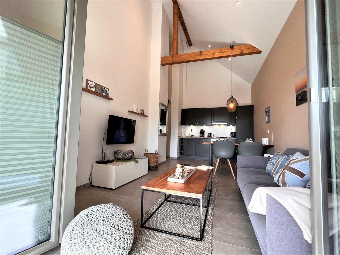 Über den Eingangsbereich mit Garderobe gelangen Sie zum Wohn- und Essbereich. Im vorderen Bereich bietet die in grau gehaltene, mit besten Markengeräten ausgestattete Küche im Landhausstil einen besonderen Fokus. Hölzerne Elemente, wie der Küchen- oder Wohnzimmertisch geben dem Raum seine Wärme, was durch die warmgelbe Wand weiter unterstützt wird. Vom Wohn-Essbereich gelangen Sie ins Schlafzimmer mit eigenem Flat-TV. Das moderne Duschbad en suite überzeugt mit heller Ausstattung, integriertem Radio, begehbarer Sommerregendusche, WC und Tageslicht.