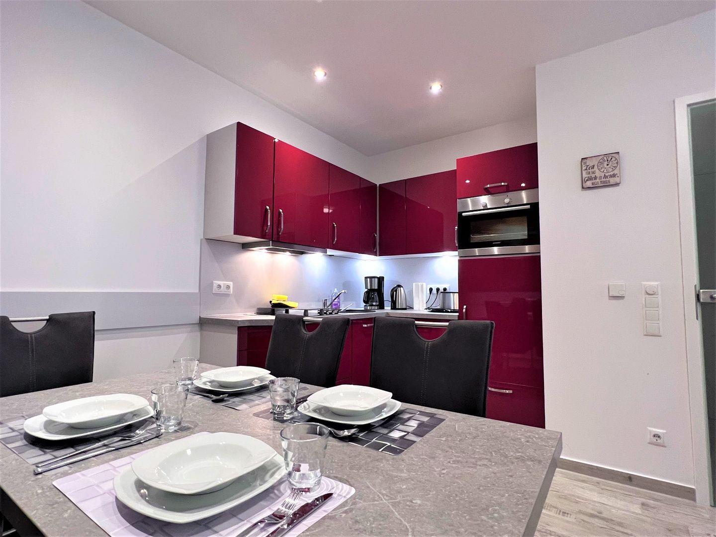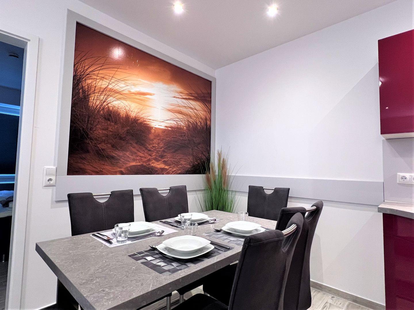 Küche: Backofen, 4-Zonen Cerankochfeld, Kühlschrank mit Gefrierfach, Dunstabzugshaube, Geschirrspüler, Toaster, Wasserkocher, Kaffeefiltermaschine, Geschirr, Esstisch mit 6 Stühlen