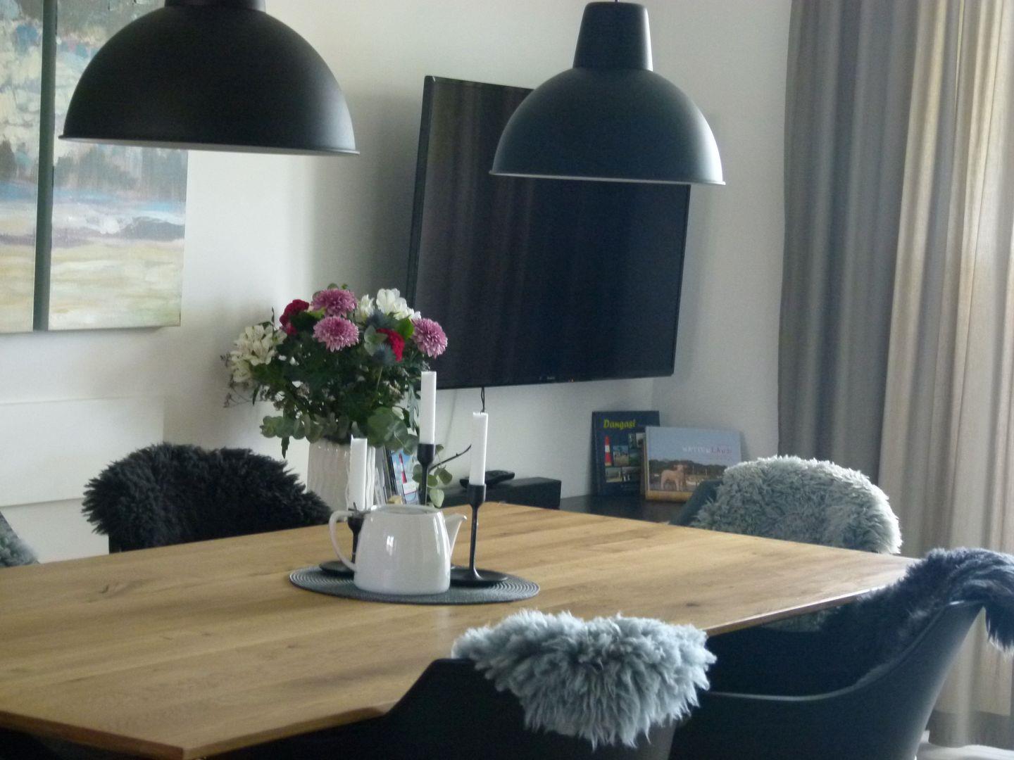 Wohn-Esszimmer: Leder-Eckcouch, Flachbildfernseher, Empfang deutschsprachiger TV-Programme (SAT-Anlage)