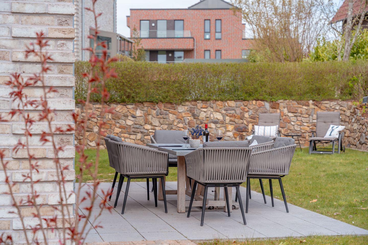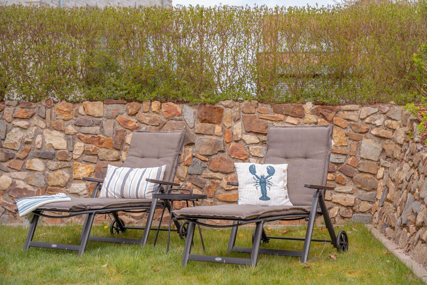 Der extragroße Garten mit 2 Terrassen lädt zum Verweilen ein und bietet ausreichend komfortablen Platz für bis zu 6 Personen an dem Esstisch im Freien.