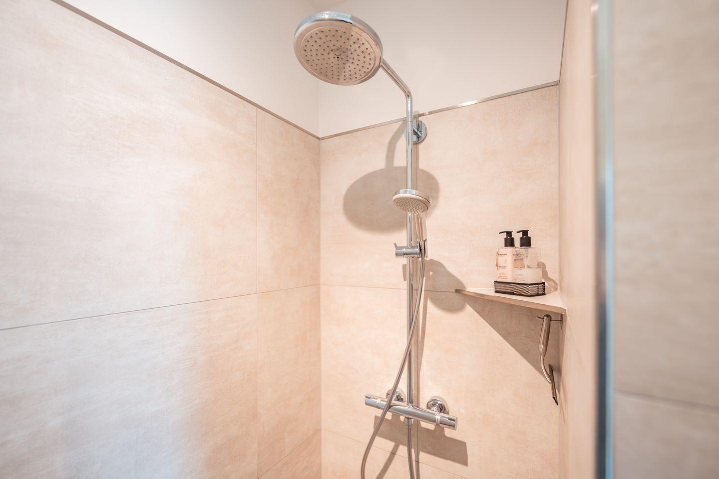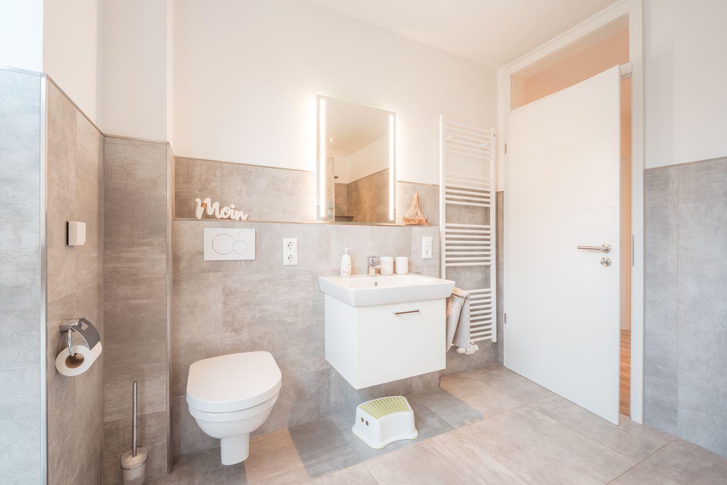 Bad und Sanitär im 1. OG: bodentiefe, barrierefreie Sommerregendusche, Badewanne, Waschtischanlage mit Spiegel, WC, Handtuchheizung, Föhn, Handtücher auf Anfrage