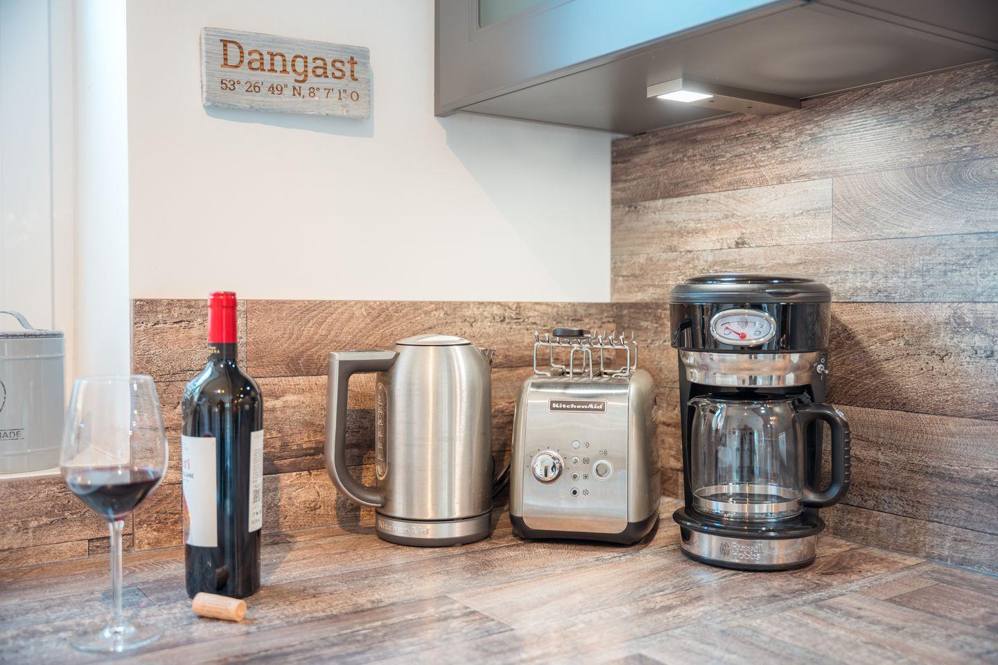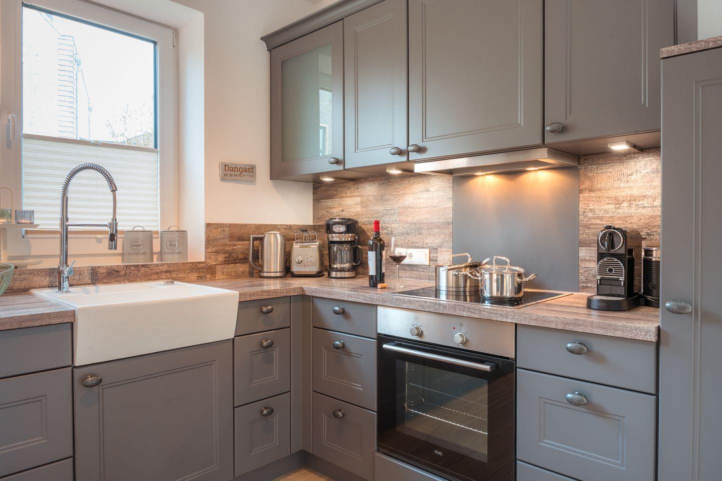 Küche und Haushalt: Einbauküche, Kühlschrank mit Gefrierfach, 4-Zonen Cerankochfeld, Backofen, Dunstabzugshaube, Mikrowelle, Geschirrspüler, Kaffeefiltermaschine + Kapselmaschine, Toaster, Wasserkocher, hochwertiges Geschirr und Besteck