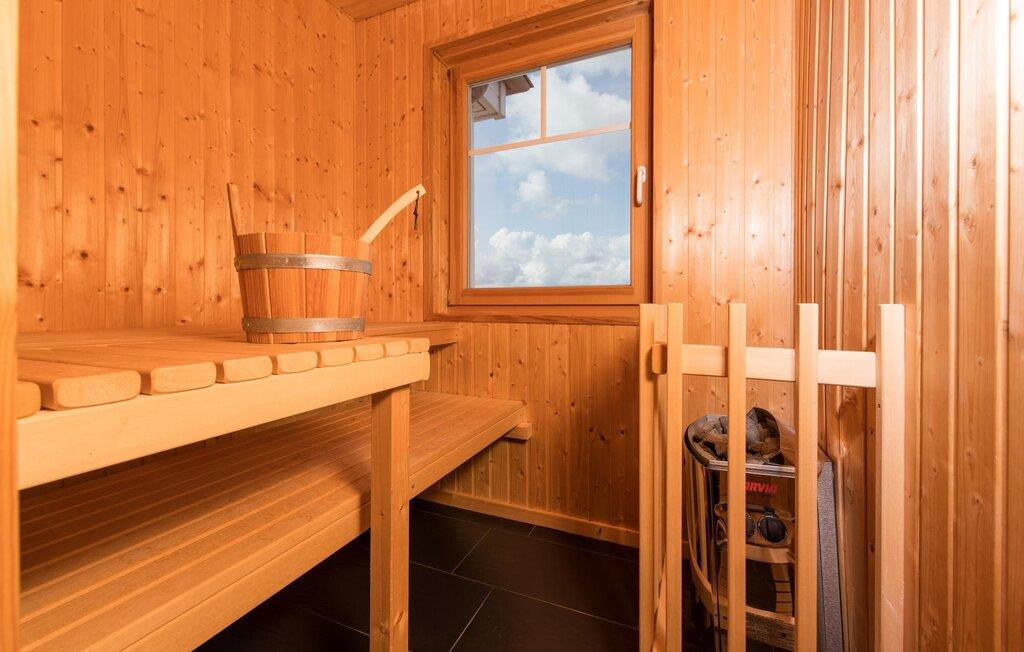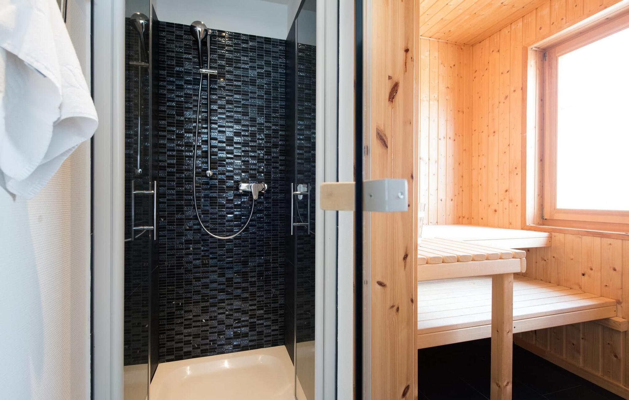 Den store finske badstuen er også tilgjengelig på dette nivået for et beroligende spaprogram. Den tilstøtende dusjen sørger for nødvendig avkjøling.