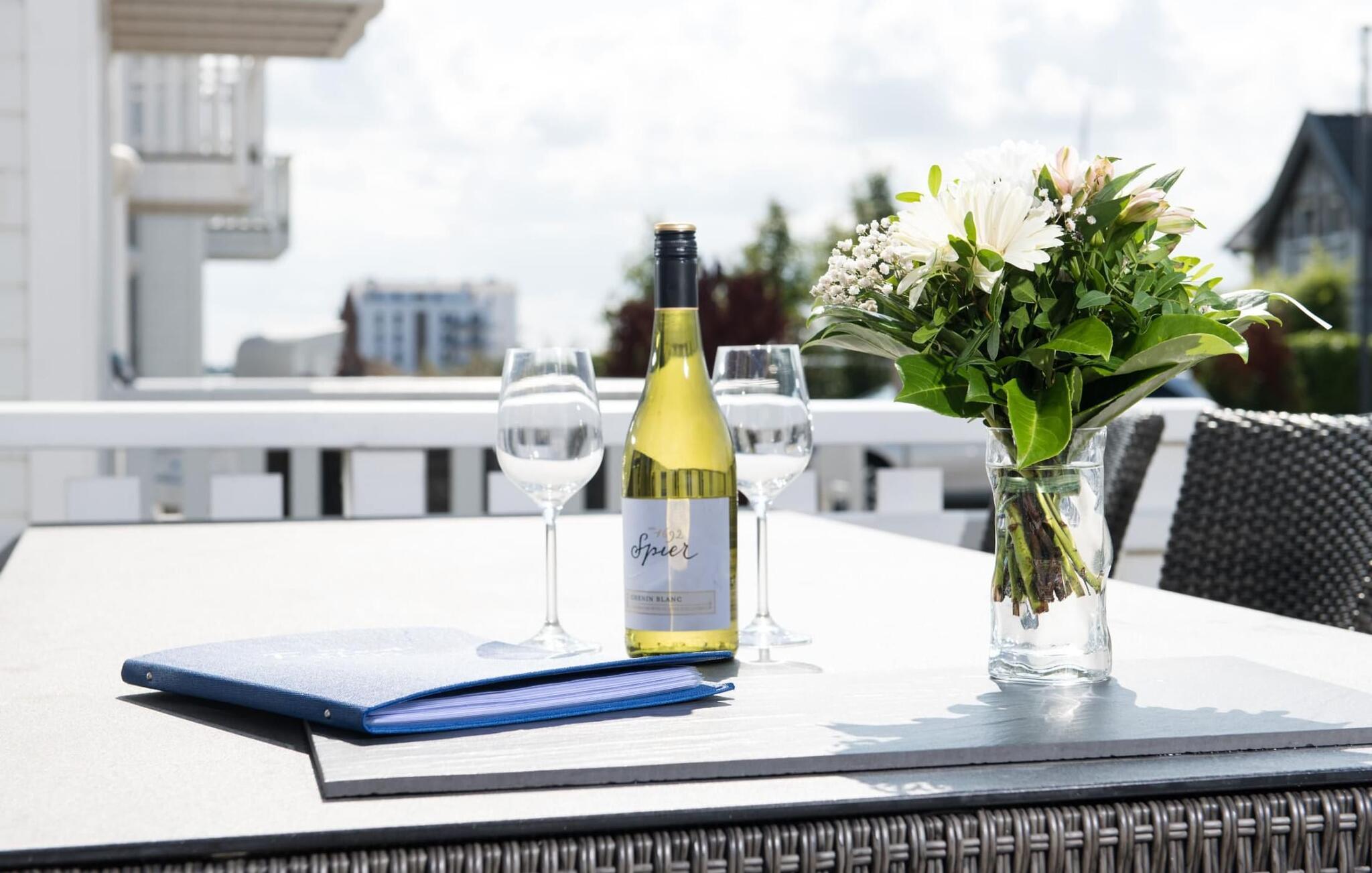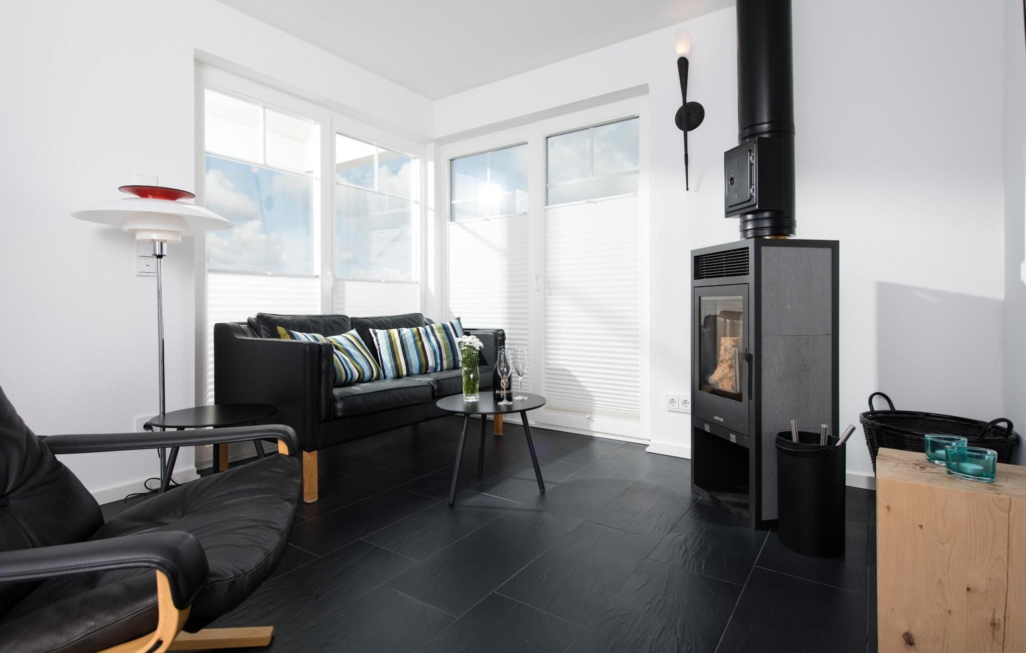 Studioet i første etasje, et ekstra oppholdsrom med en fenomenal utsikt, er det perfekte stedet å slappe av: Stranden og Østersjøen på den ene siden, havnen og Schlei på den andre. Den omkringliggende takterrassen innbyr til soling og romantiske solnedganger. Enten det er med en bok og vin, en spennende film eller romantisk foran den knitrende ilden i peisen, er studioet høydepunktet i Strandvillaen, for her kan du slappe av.