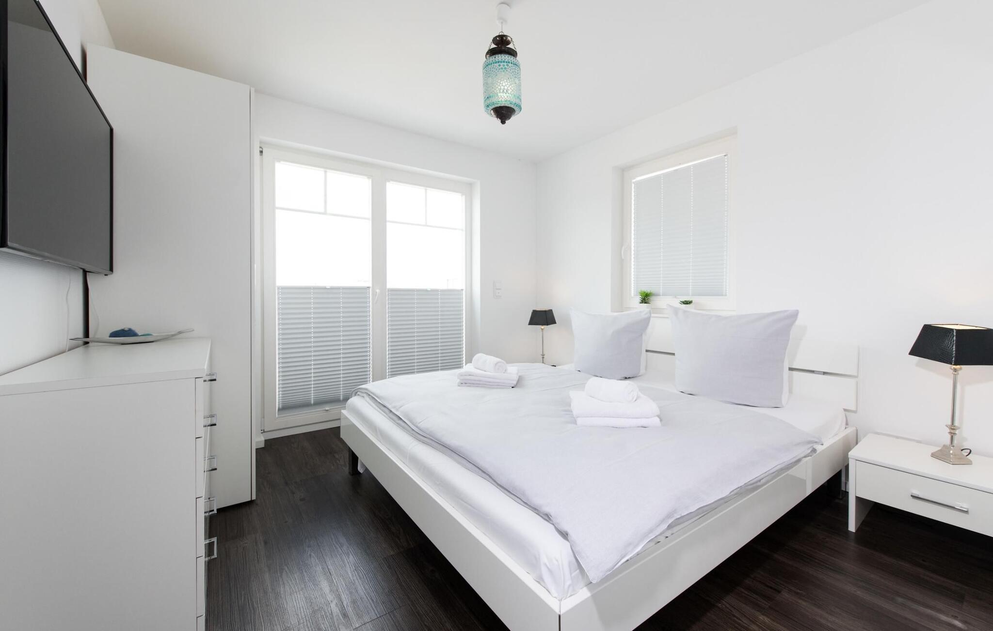 Feriehuset har to koselige soverom i første etasje. Hovedsoverommet er drømmeaktig i ordets rette forstand, for i tillegg til sin egen solfylte balkong, kan du våkne og sovne her med en fantastisk utsikt over Schlei og marinaen.