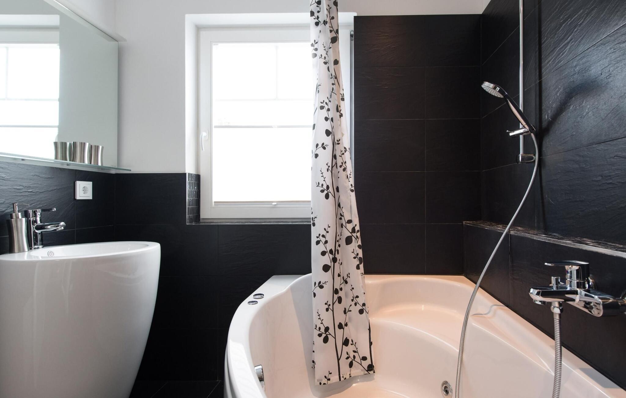 Et stort bad med hjørneboblebad for to personer sørger også for velværeøyeblikk på dette nivået.