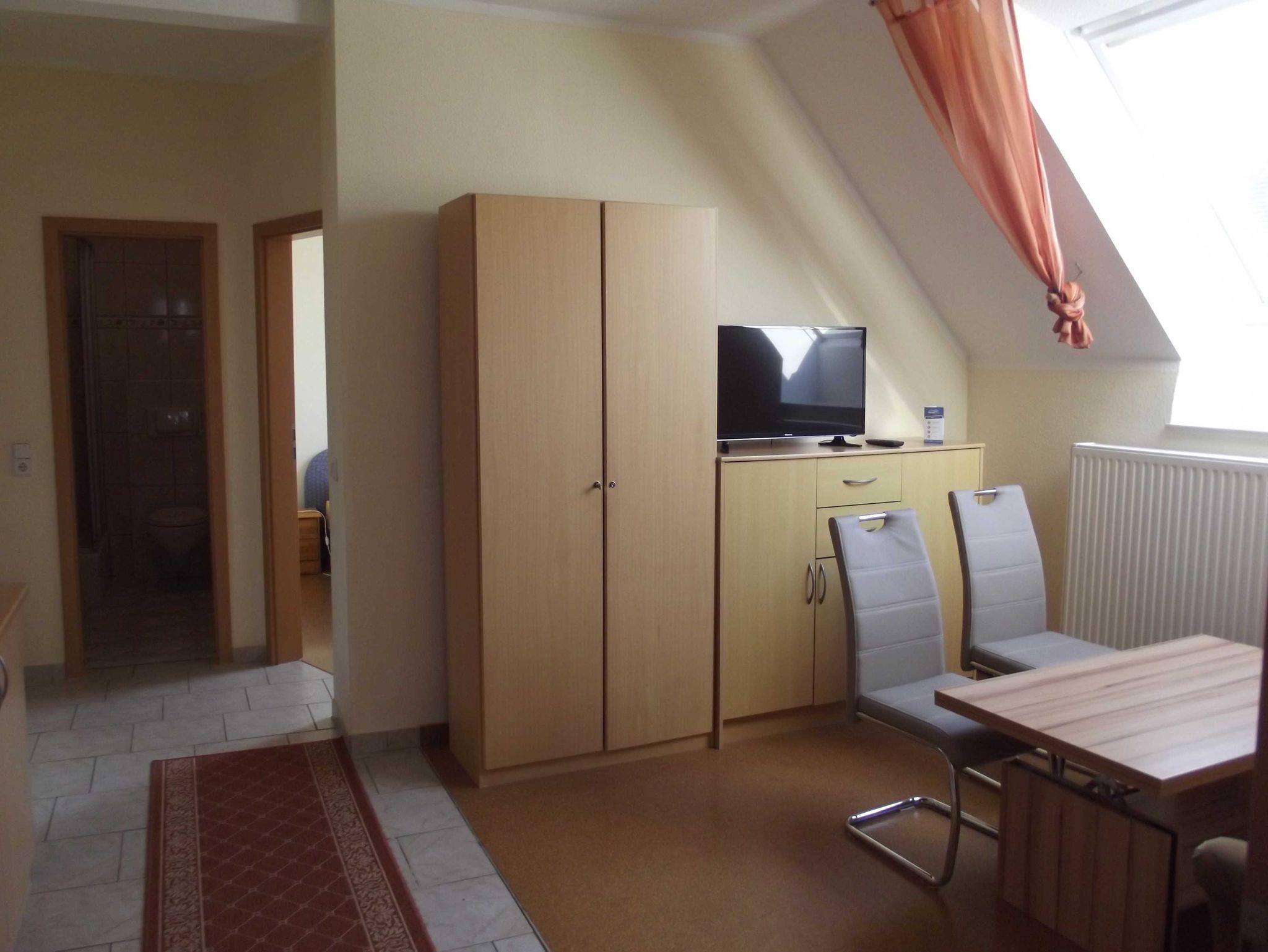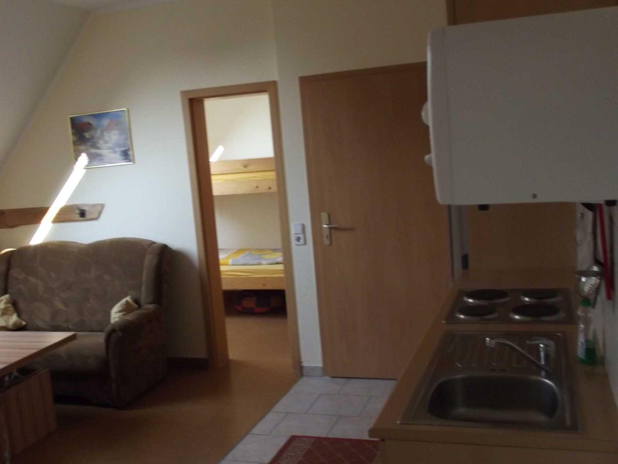 2005 neu eingerichtet, 1. OG, 36 m², ruhige Lage, für 2 Erwachsene und 2 Kinder Wohnzimmer mit Couch, Couchtisch, 2 Stühle, kleine Schrankwand mit Sat-TV, komplette Küchenzeile mit E-Herd und Backofen, Wasserkocher, Toaster, Kaffeemaschine, Microwelle, Schlafzimmer mit Doppelbett und Nachtschränken, Kinderzimmer mit Doppelstockbett und Nachtschrank, Badezimmer mit Dusche und WC, Sitzgelegenheit mit Gartenmöbeln auf dem Grundstück