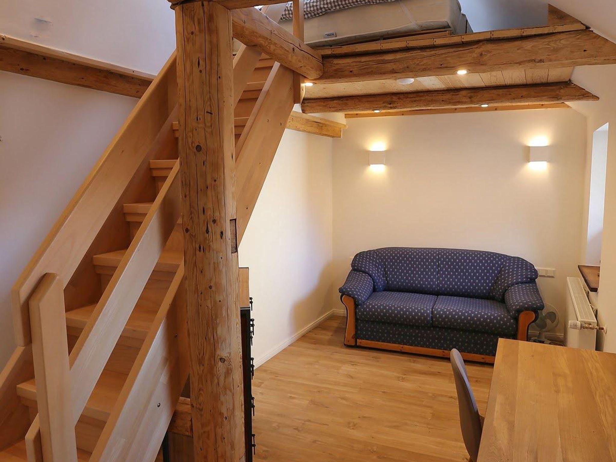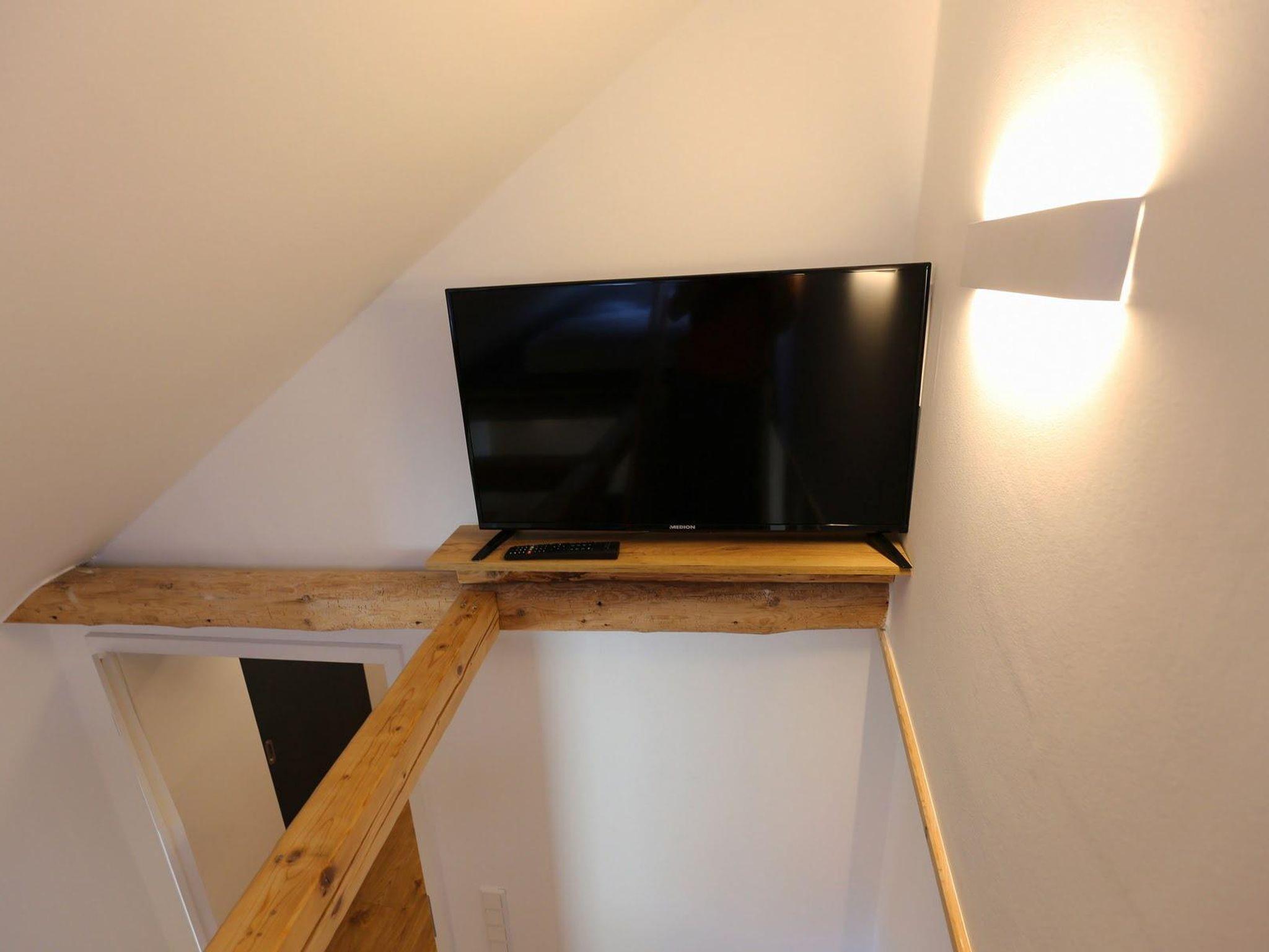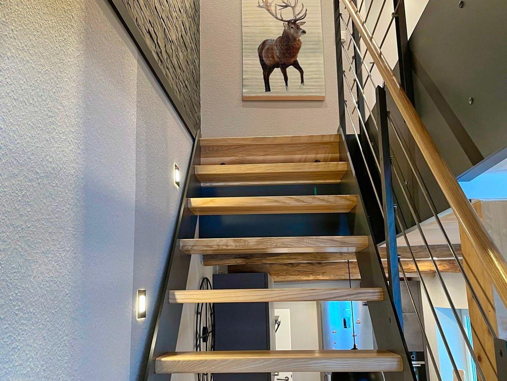 Die Ferienwohnung verfügt über 90qm auf zwei Ebenen. Im EG befindet sich der gemütliche Wohnbereich mit einer großzügigen, vollausgestatteten, offenen Küche. Die Barhocker laden zu einem Aperitivo ein und bieten genügend Platz für ein ausgiebiges Frühstück und kleine Mahlzeiten. Im Freisitz/Aussenbereich sind Grill und Sitzmöglichkeiten vorhanden. Über die im Wohnbereich integrierte Geschosstreppe mit Eschenholz im Industriestyle erreichen unsere Gäste bequem das OG ohne Dachschrägen, eine begehbare Schlaf-Empore bildet Highlight für jüngere Gäste. Selbstverständlich kann dieses Zimmer weitere Erwachsene zur Nacht aufnehmen oder aber als ruhiges Arbeits- und Lesezimmer mit viel Tageslicht dienen. Alle Wohn- und Schlafräume mit modernen Flat-TVs ausgestattet. Die walk-in Dusche und Infrarotkabine lässt Wellnessgefühle aufkommen. Der Handtuchhalter sorgte für vorgewärmte kuschlige Badetücher und an kalten Tagen schafft die elektrische Fußbodenheizung ein wunderbares Wohlgefühl.