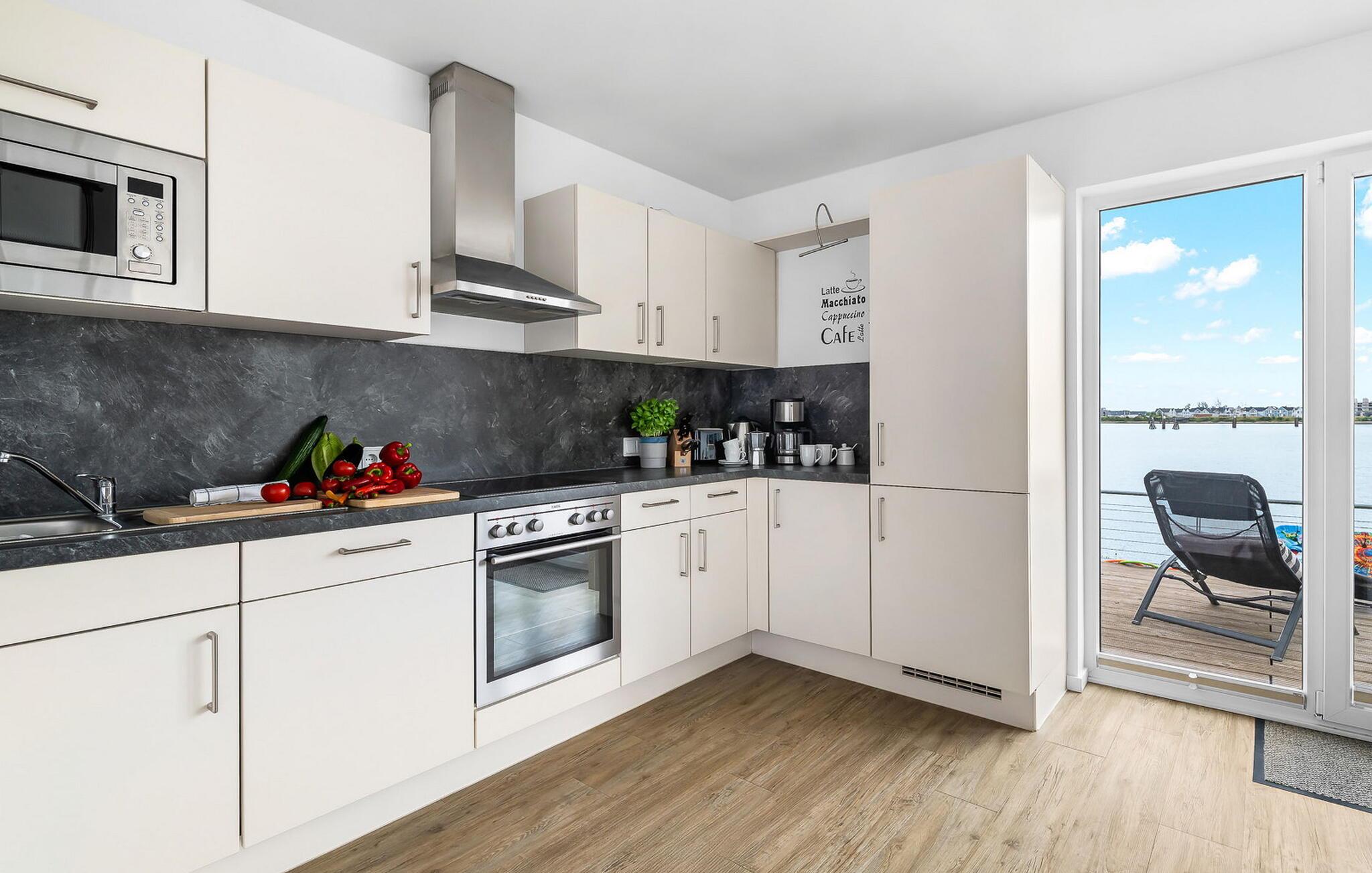 Leiligheten imponerer med sin åpne planløsning med gulv-til-tak-vinduer som slipper inn rikelig med naturlig lys og gir en fantastisk utsikt over havnen. Utstyret inkluderer smart-TV, WiFi og Blu-ray-spiller, så det mangler ikke på underholdningsmuligheter. Gulvvarmen sørger for behagelig varme i hele leiligheten, selv i den kalde årstiden.