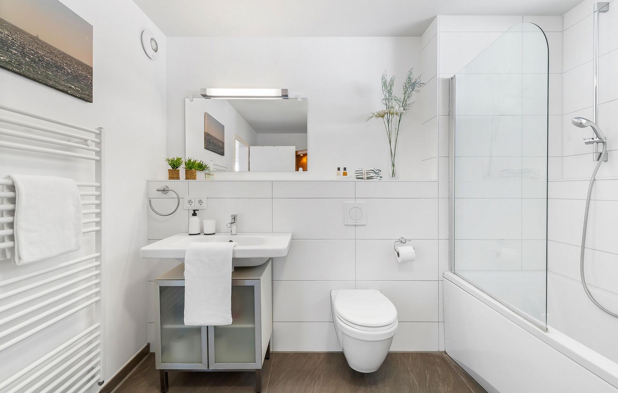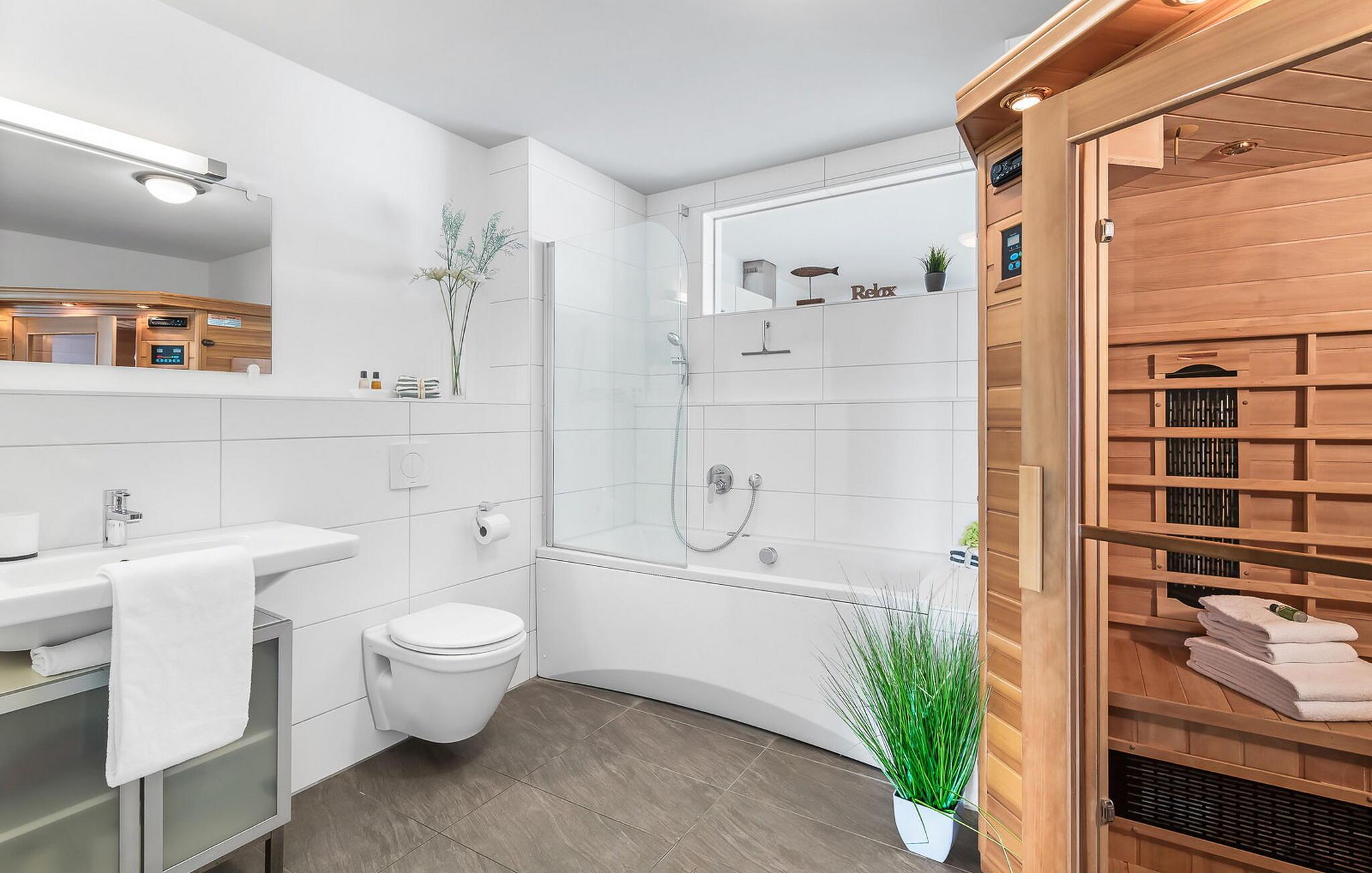 Det moderne badet er utstyrt med badekar, som også kan brukes som dusj, samt en infrarød kabine for velværeelskere.