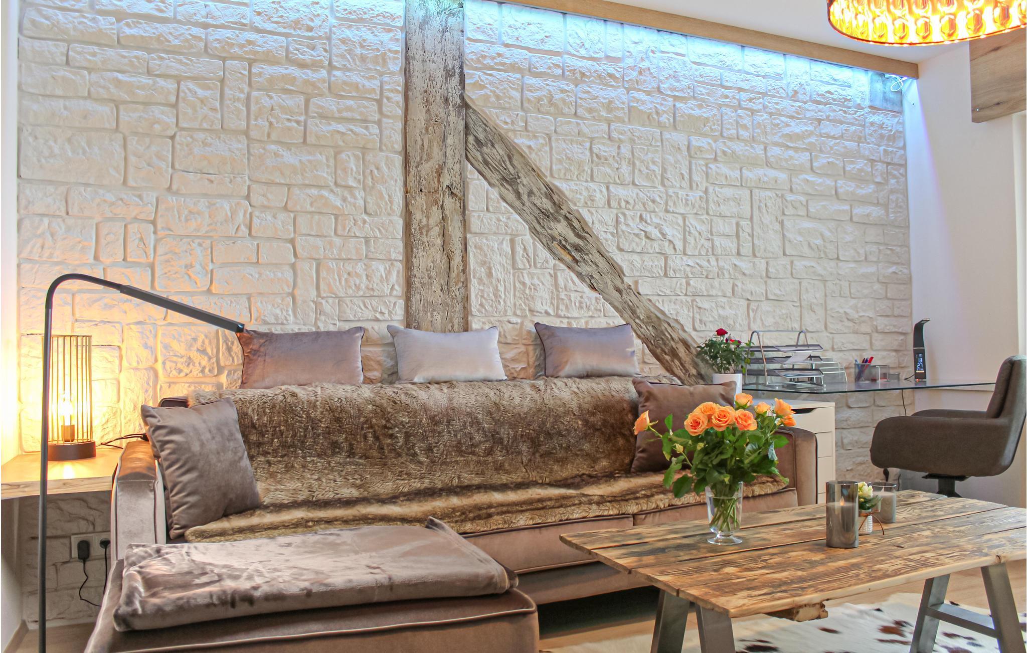 De kjærlig innredede oppholdsrommene er delt inn i et soverom, et bad (i kjelleren), et spisekjøkken og en stue - ideelt for et par. Husets hjerte er den vakre stuen, hvor du kan slappe av i sofaen etter en aktiv feriedag. Kjøkkenet er utstyrt med alle viktige redskaper og apparater og inviterer deg til å lage mat sammen.