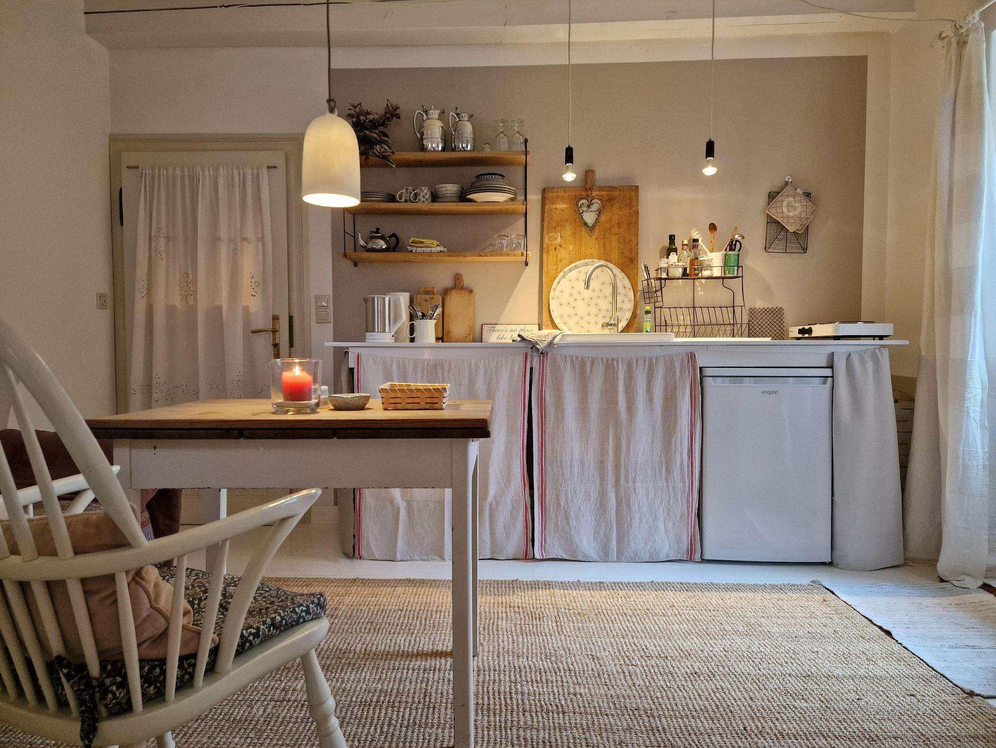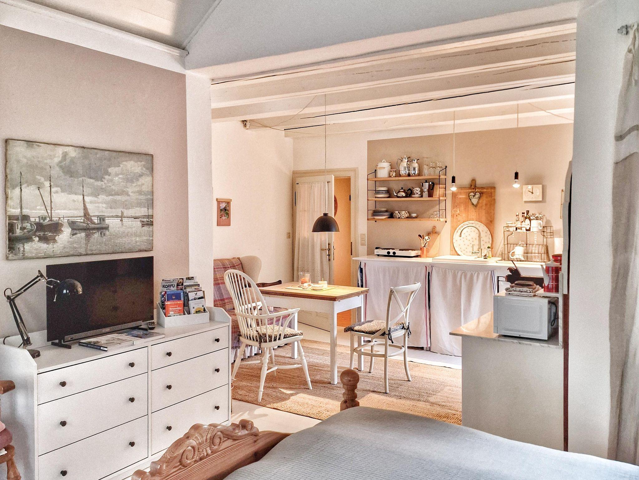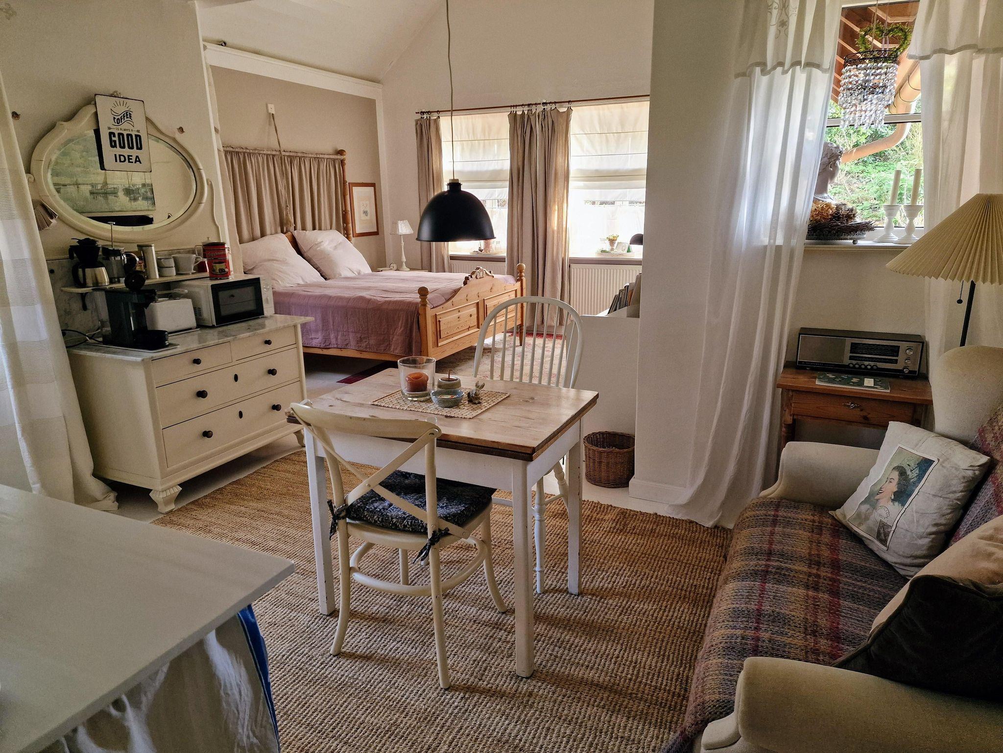 Es gibt eine gemütliche Einrichtung mit Küche, Eßplatz mit Sofa und ein großes Doppelbett. Ein Kleiderschrank und eine Kommode zur Aufbewahrung von Kleidung ist vorhanden. Der kleinen Flur mit Garderobe führt zum geräumigen Bad, mit Dusche, WC und Doppelwaschbecken. Die Küchenzeile ist ausgestattet mit Kühlschrank, Mikrowelle, Wasserkocher, Kaffeemaschine, Toaster und 2 Kochplatten. Die Terrasse hat Morgensonne und einen gemütlichen Sitzplatz mit Sonnenschirm. WLAN und den Parkplatz vor dem Haus können Sie kostenfrei nutzen.