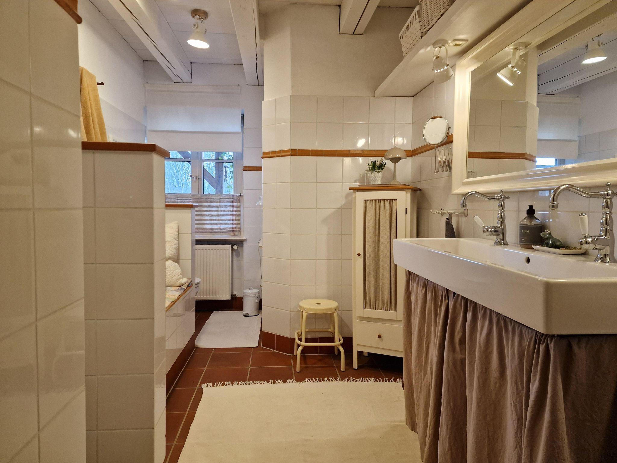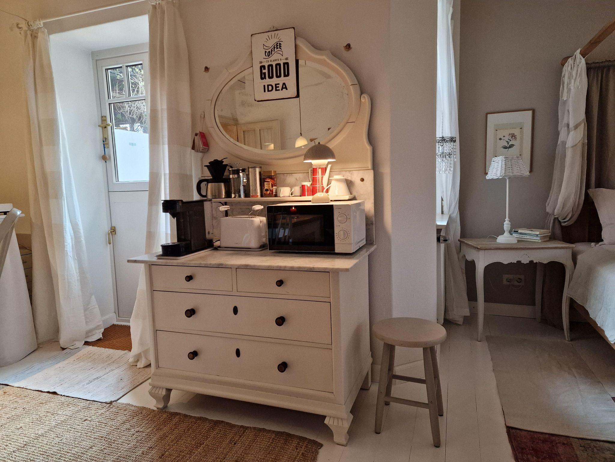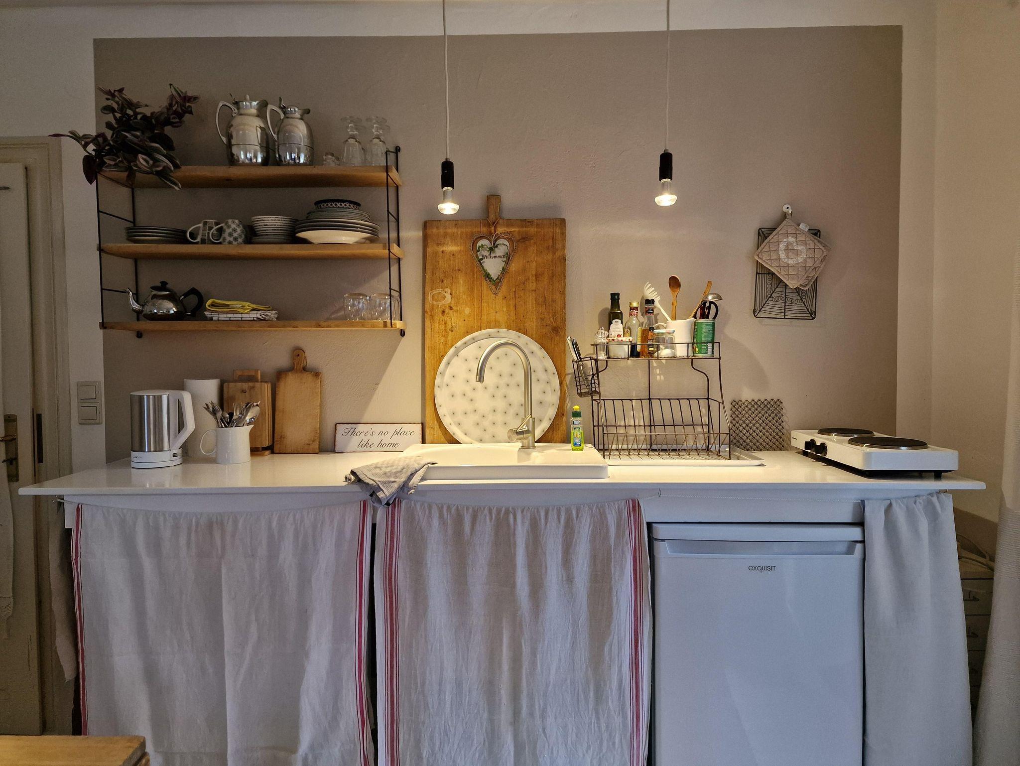 Es gibt eine gemütliche Einrichtung mit Küche, Eßplatz mit Sofa und ein großes Doppelbett. Ein Kleiderschrank und eine Kommode zur Aufbewahrung von Kleidung ist vorhanden. Der kleinen Flur mit Garderobe führt zum geräumigen Bad, mit Dusche, WC und Doppelwaschbecken. Die Küchenzeile ist ausgestattet mit Kühlschrank, Mikrowelle, Wasserkocher, Kaffeemaschine, Toaster und 2 Kochplatten. Die Terrasse hat Morgensonne und einen gemütlichen Sitzplatz mit Sonnenschirm. WLAN und den Parkplatz vor dem Haus können Sie kostenfrei nutzen.