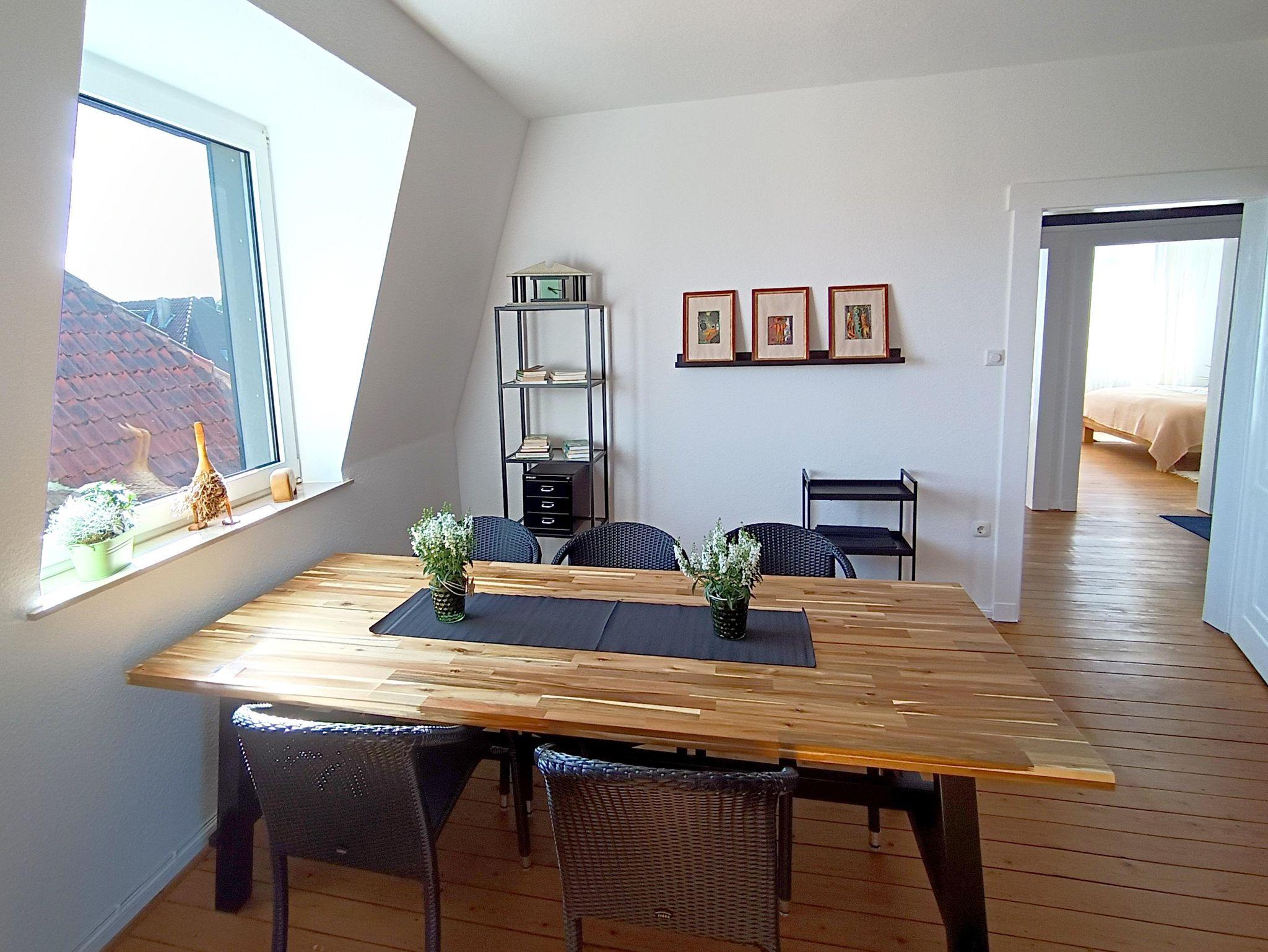 Die Ferienwohnung bietet einen schönen Blick auf die historische Altstadt und überzeugt durch eine praktische Aufteilung. Im Wohnzimmer mit Designer Ledersofa, TV und HiFi-Anlage lässt es sich entspannen, während die voll ausgestattete Küche und das großzügige Esszimmer für komfortable Mahlzeiten sorgen. Zwei Schlafzimmer mit modernen Doppelbetten bieten eine ruhige Schlafumgebung. Das Tageslichtbad mit Dusche und Badewanne sorgt für zusätzlichen Komfort. Eine Terrasse und ein Balkon laden zum Verweilen ein.