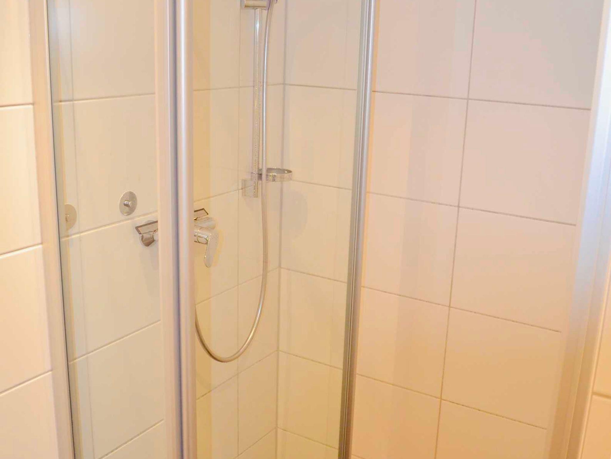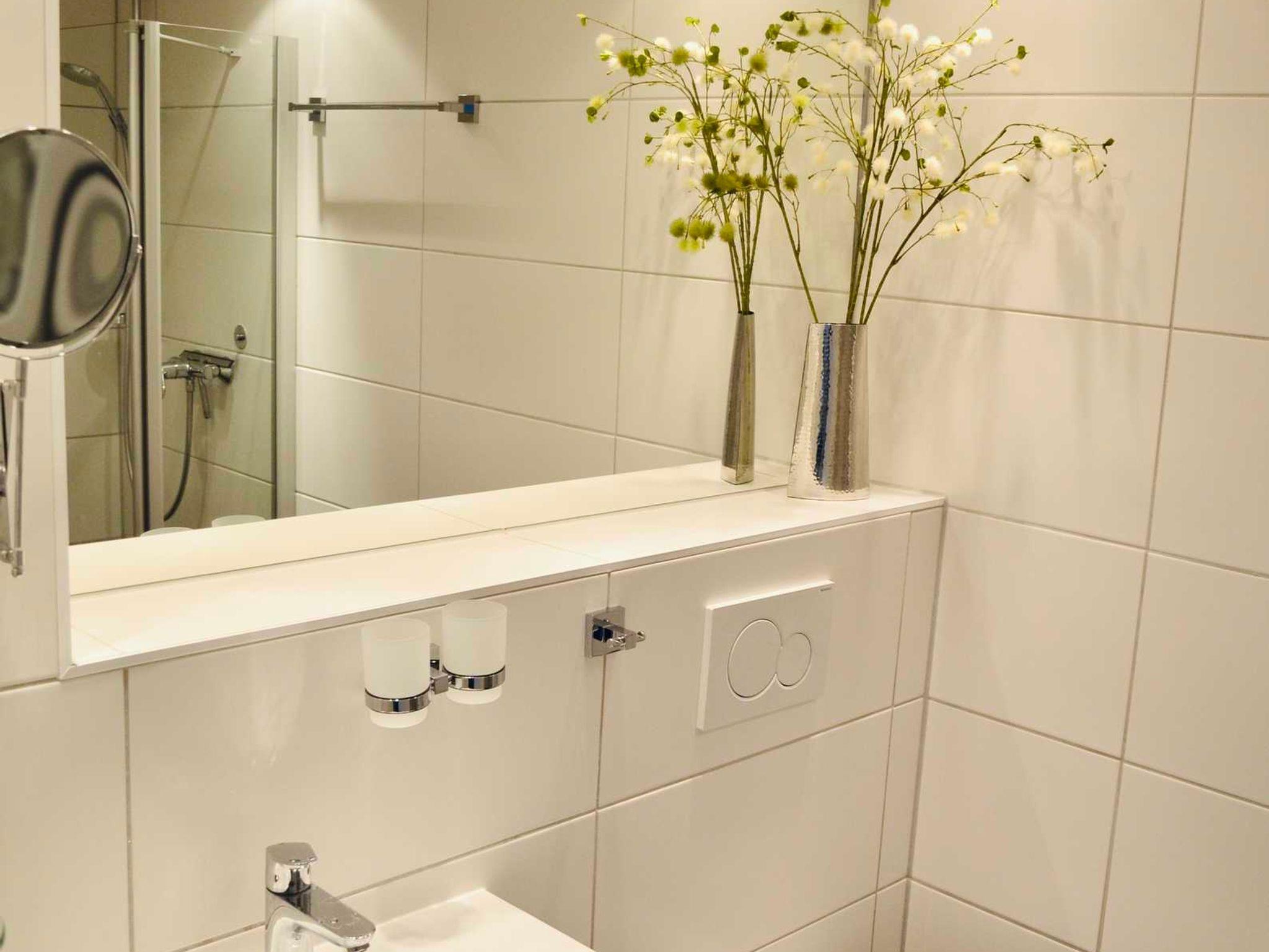 • Das Bad ist ausgestattet mit einem Waschbecken, einem großem Spiegel, WC, Handtuchheizkörper, Kosmetikspiegel, Fön und einer ebenerdigen Dusche mit Glasabtrennung.