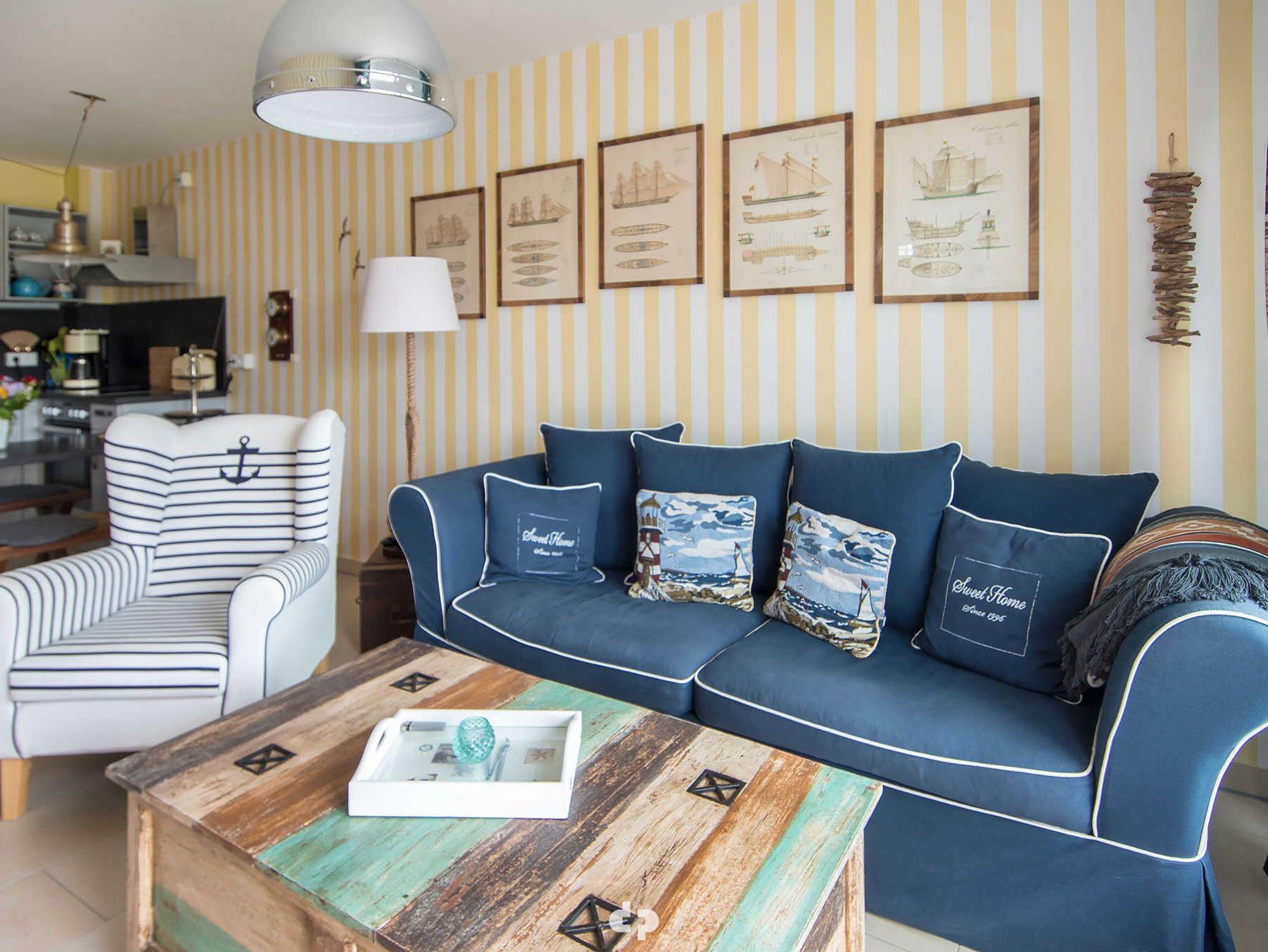 Der Wohnbereich ist mit maritimen Möbeln, einer Couch mit passendem Sessel und TV ausgestattet.