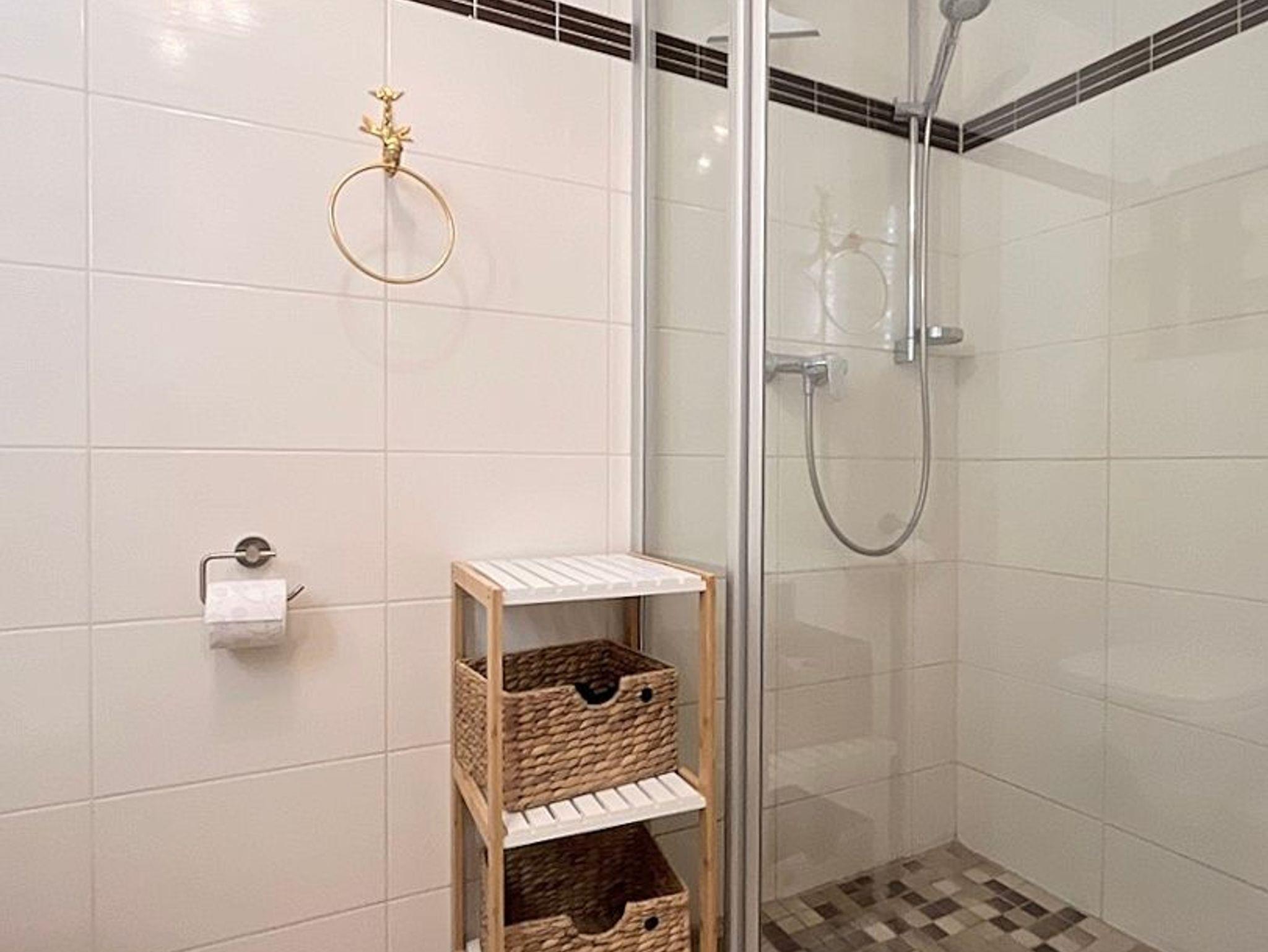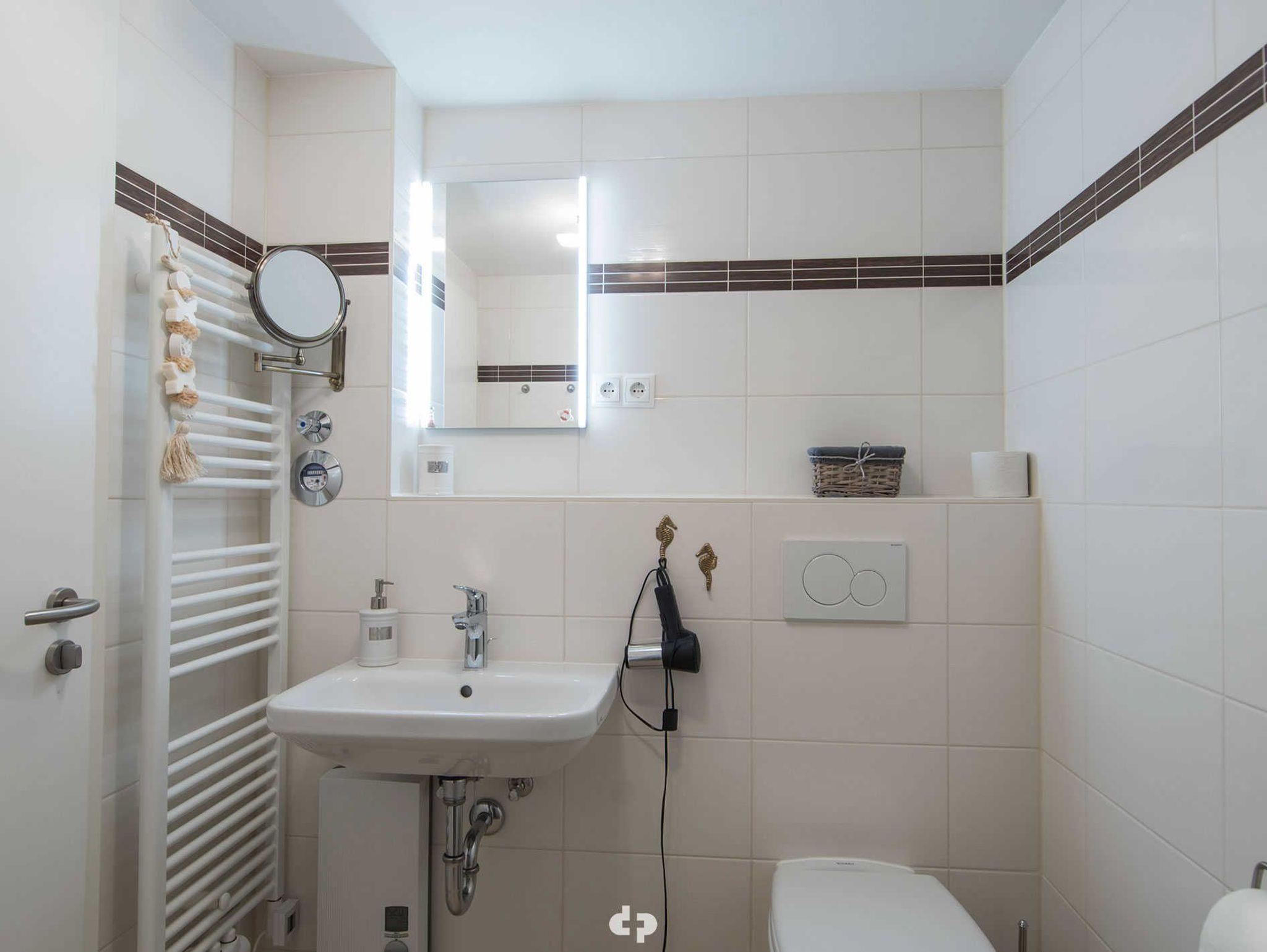 Das Bad verfügt über eine großzügige Dusche, einen Waschplatz und Handtuchheizkörper und WC.