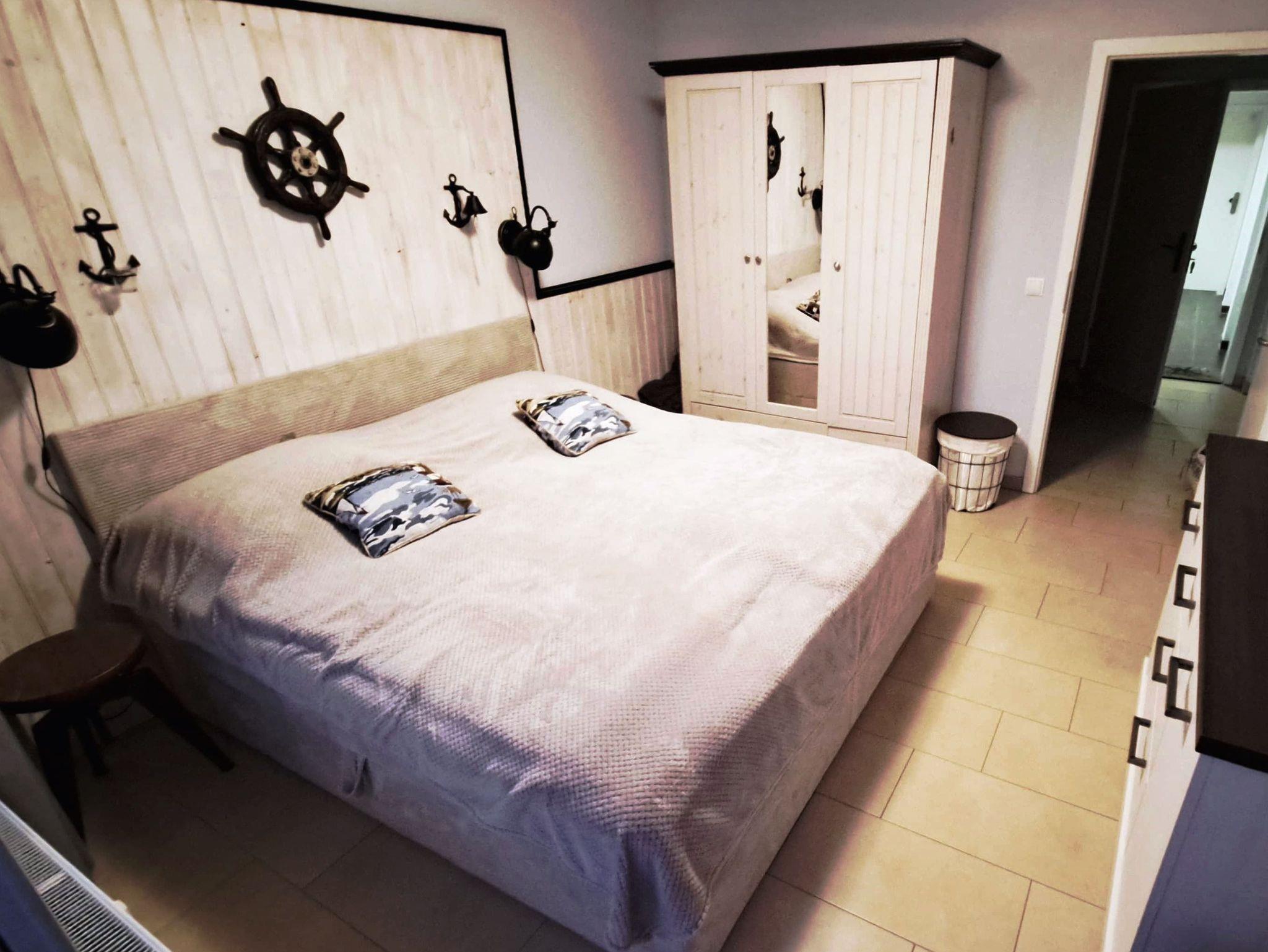 Im Schlafzimmer befindet sich ein hochwertiges Boxpringbett (Matratze 180x200) sowie ein 3-türiger Kleiderschrank. Neben dem Boxspringbett steht noch eine klappbare Gästeliege zur Verfügung. Die Gästeliege kann je nach Bedarf im Wohnzimmer aufgestellt werden.