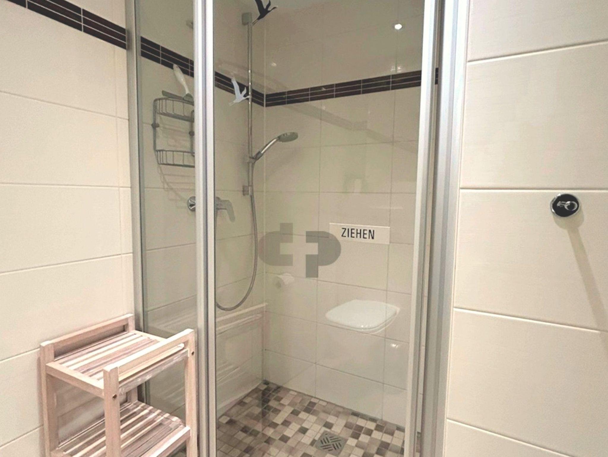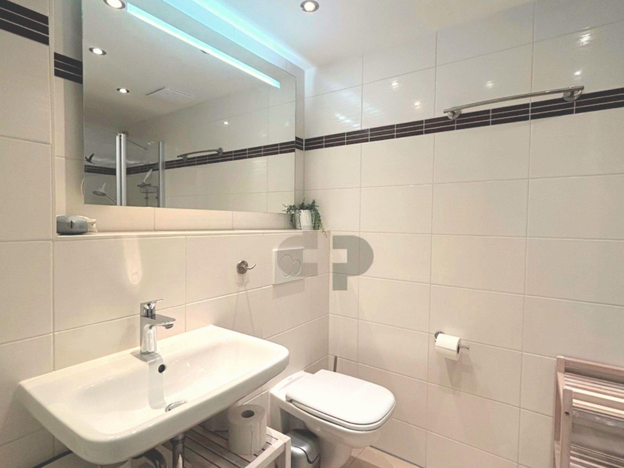 • Das Bad bietet eine großzügige ebenerdige Dusche, einen Waschplatz, einen Handtuchheizkörper sowie ein WC.