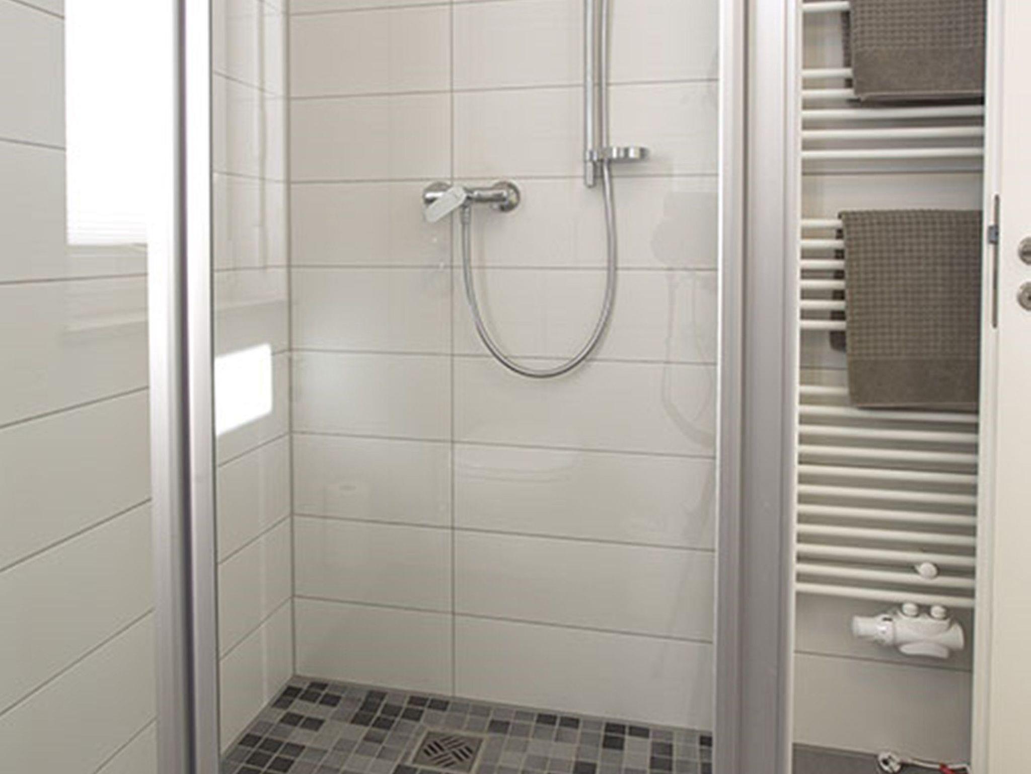 • Im hellen, Tageslichtbad erwartet Sie eine große Dusche, ein Handtuchheizkörper, ein Waschplatz und genügend Ablagefläche.