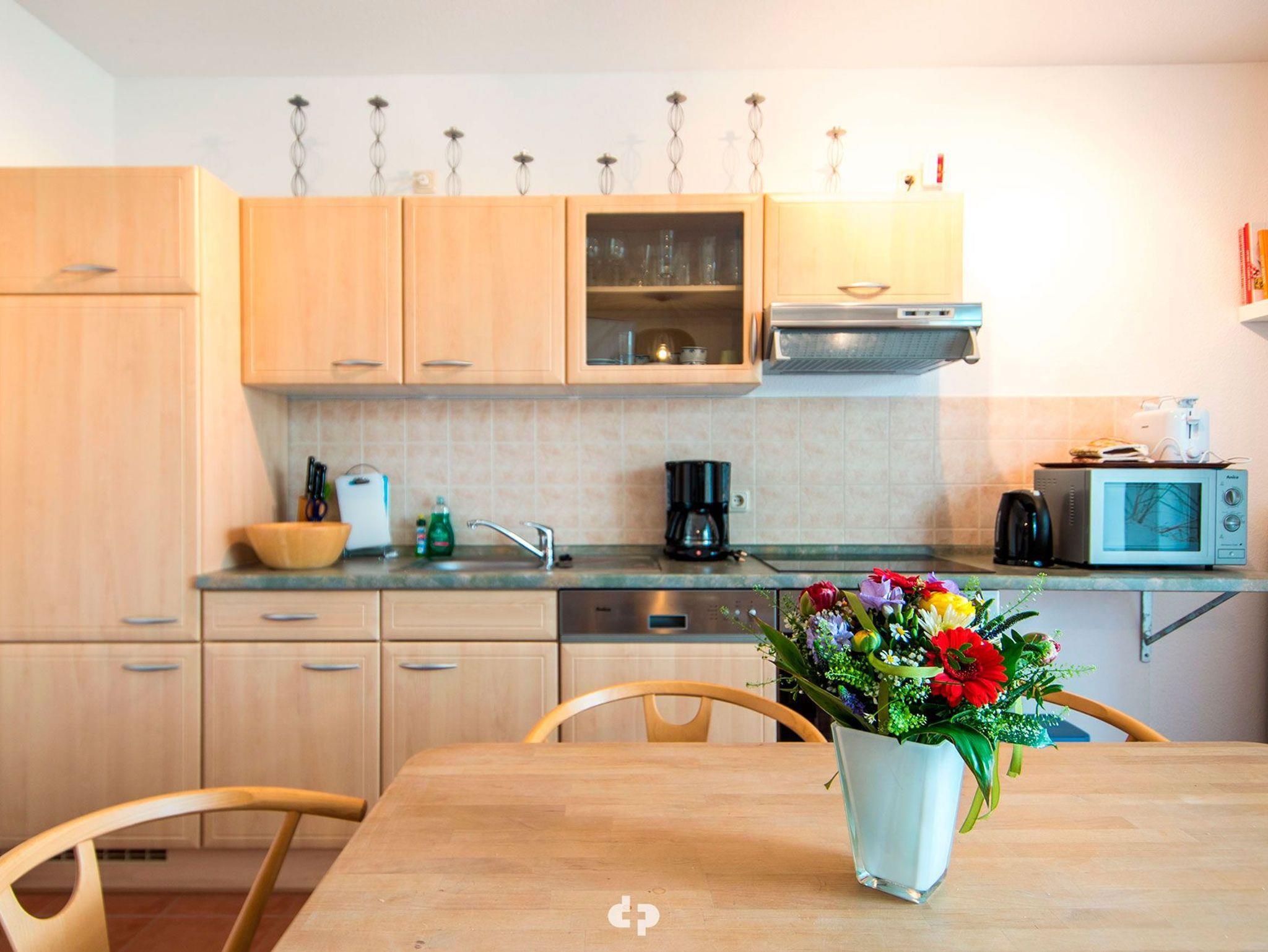 • Die Einbauküche verfügt über ein Cerankochfeld, Backofen, Geschirrspüler, Kühlschrank mit Gefrierfach, Kaffeemaschine, Mikrowelle, Wasserkocher, Toaster und selbstverständlich ausreichend Geschirr und Besteck.