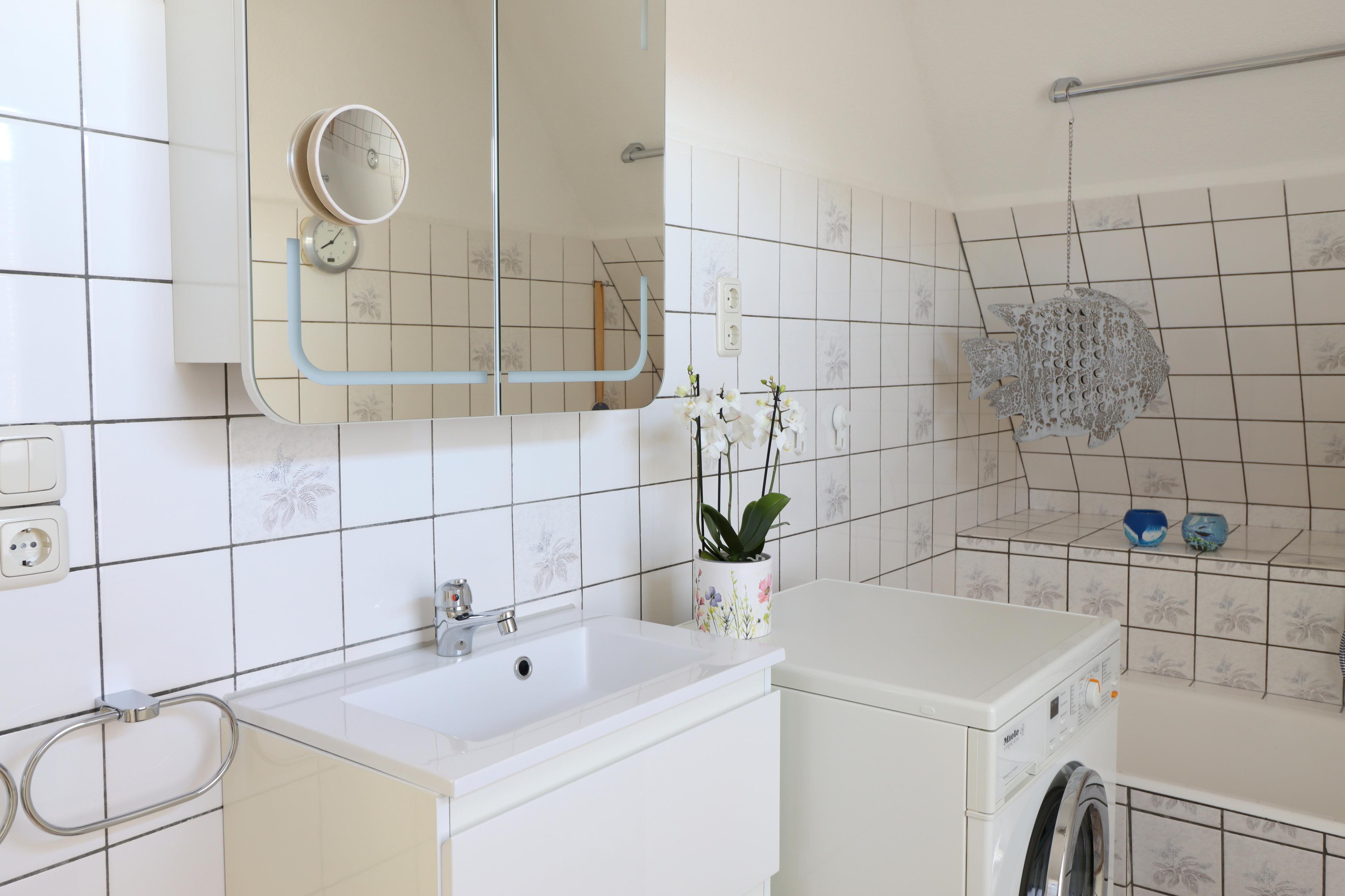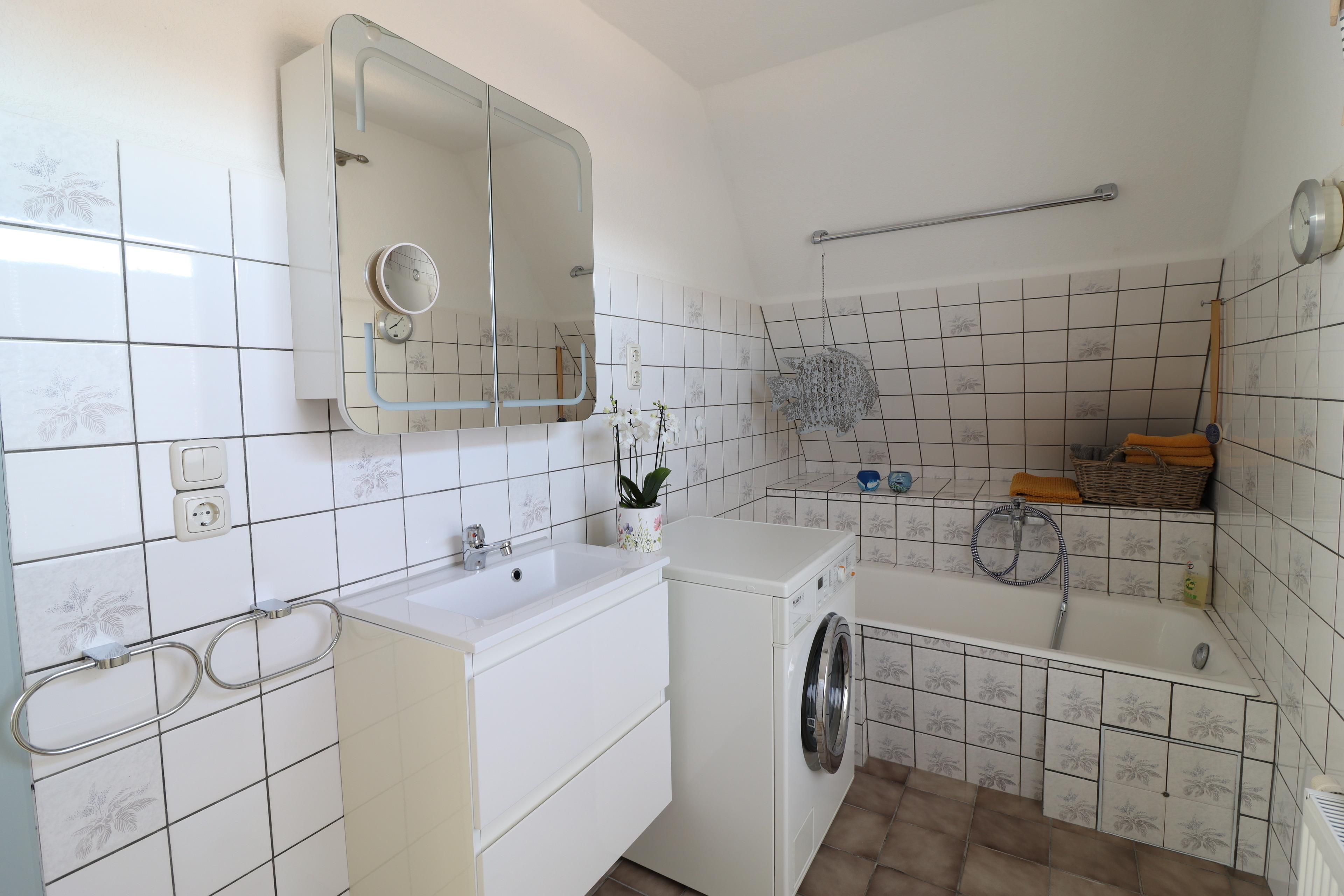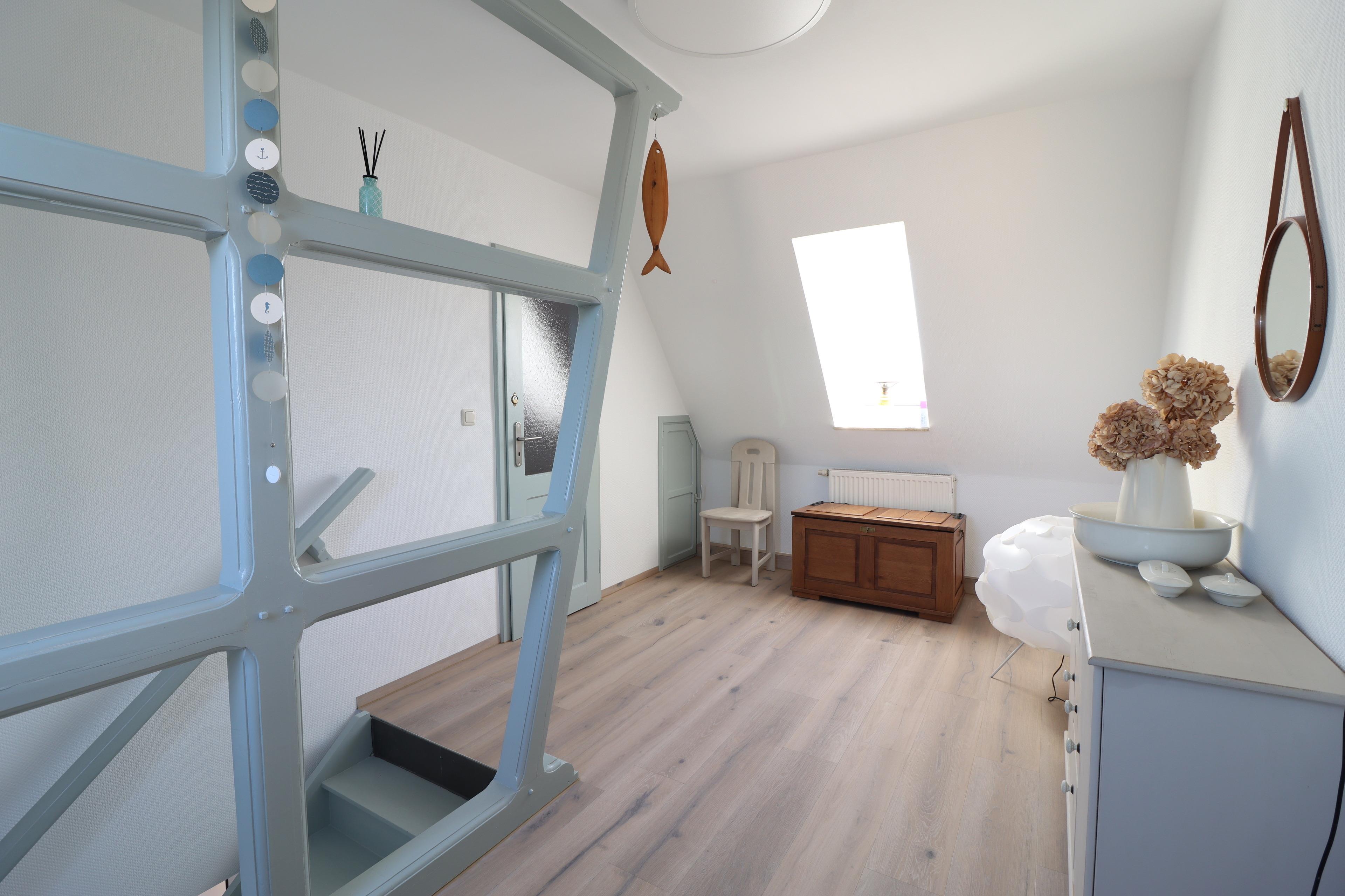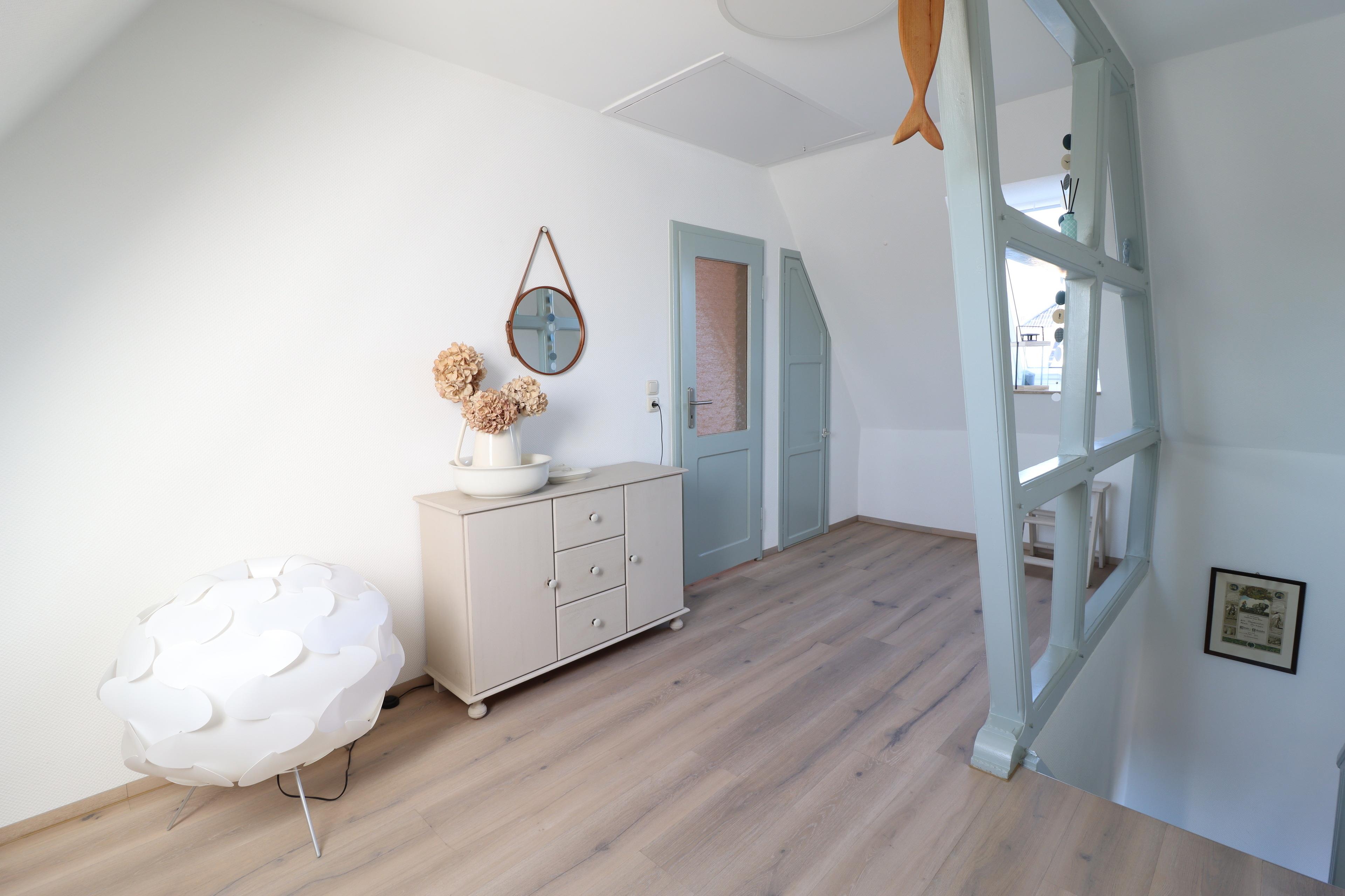 Im Obergeschoss befindet sich ein großes Schlafzimmer, das durch einen abgeteilten kleinen Raum ergänzt wird - ideal als zusätzliche Schlafmöglichkeit, Rückzugsort oder Ankleide. Das helle Badezimmer verfügt sowohl über eine Dusche als auch eine Badewanne und lädt zum Wohlfühlen ein.