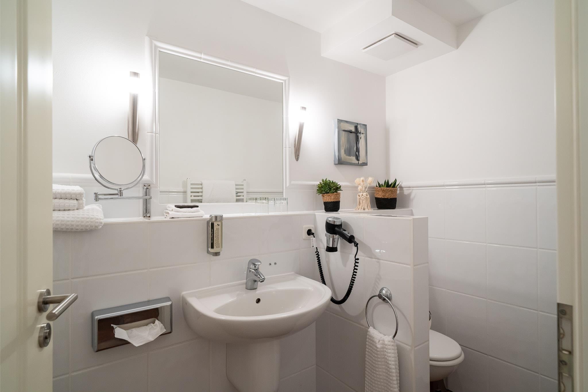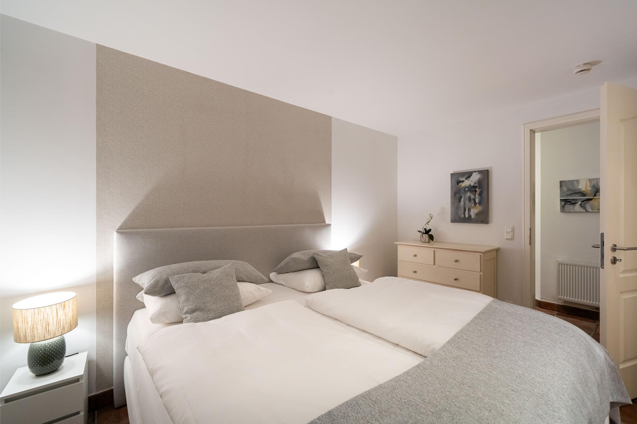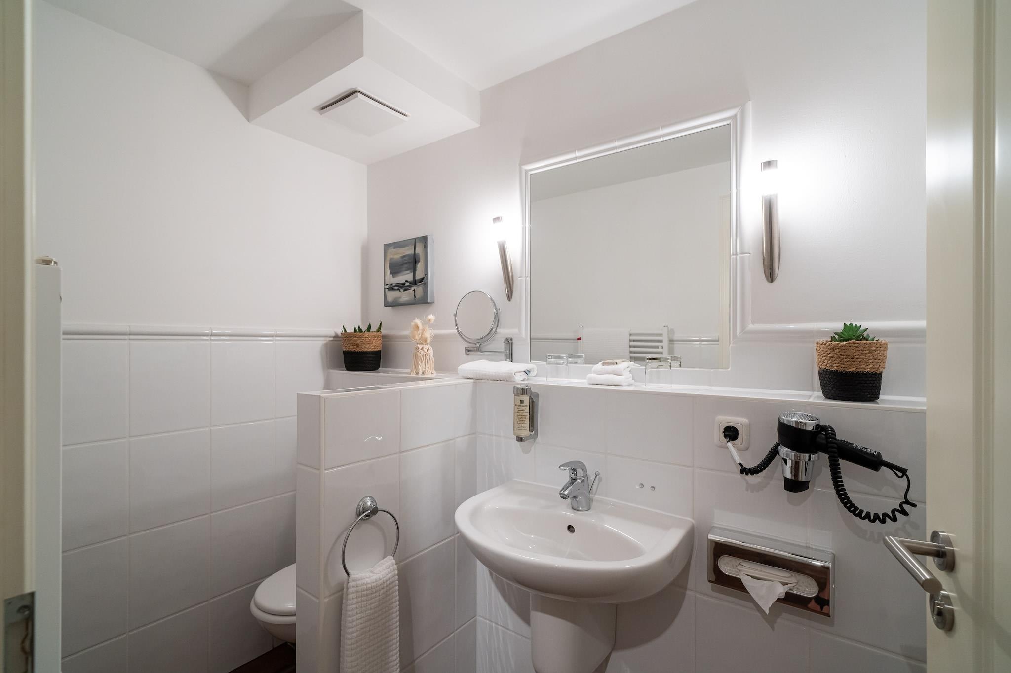 Denne eksklusive kjellerleiligheten har plass til opptil to personer – ideell for par eller enslige reisende som verdsetter komfort og ro. Det separate soverommet sikrer privatliv, mens den koselige stuen inviterer deg til å slappe av. Det moderne badet fullfører den romslige boenheten. Med møbler av høy kvalitet, en sjarmerende atmosfære og en rolig beliggenhet er denne leiligheten det perfekte tilfluktsstedet – enten det er for en kort tur eller et lengre opphold. Her kan du nyte privatliv og komfort i en avslappet atmosfære. Prisen inkluderer internettilgang over hele hotellet og gratis parkering. Det 4500 m² store velvære- og spa-området med svømmebasseng, badstueanlegg og stort treningsrom kan brukes mot et gebyr: svømmebassenget og badstuen koster EURO20 per person/dag, og treningsområdet koster EURO15 per person/dag. Daglige aktiviteter som yoga, vannfitness og ryggfitness fullfører programmet. I skoleferiene venter et variert barnepassprogram på barna. Skifte av sengetøy er inkludert for opphold på 7 dager eller mer; ekstra mellomrengjøring med skifte av sengetøy kan bestilles på stedet for EURO150.