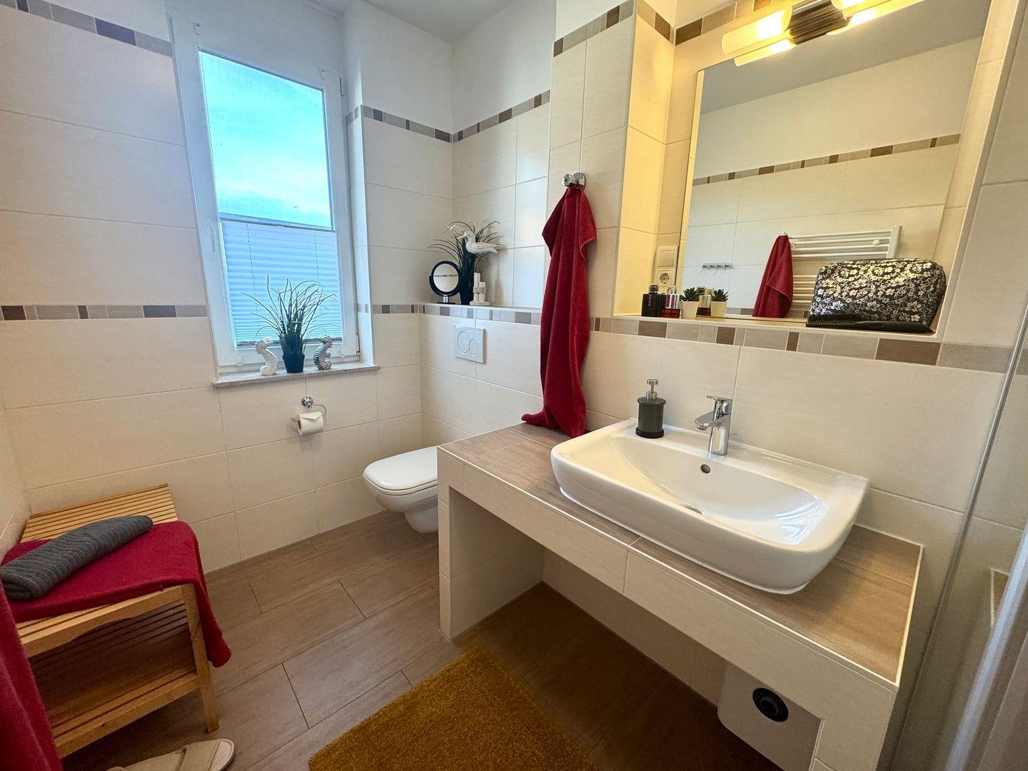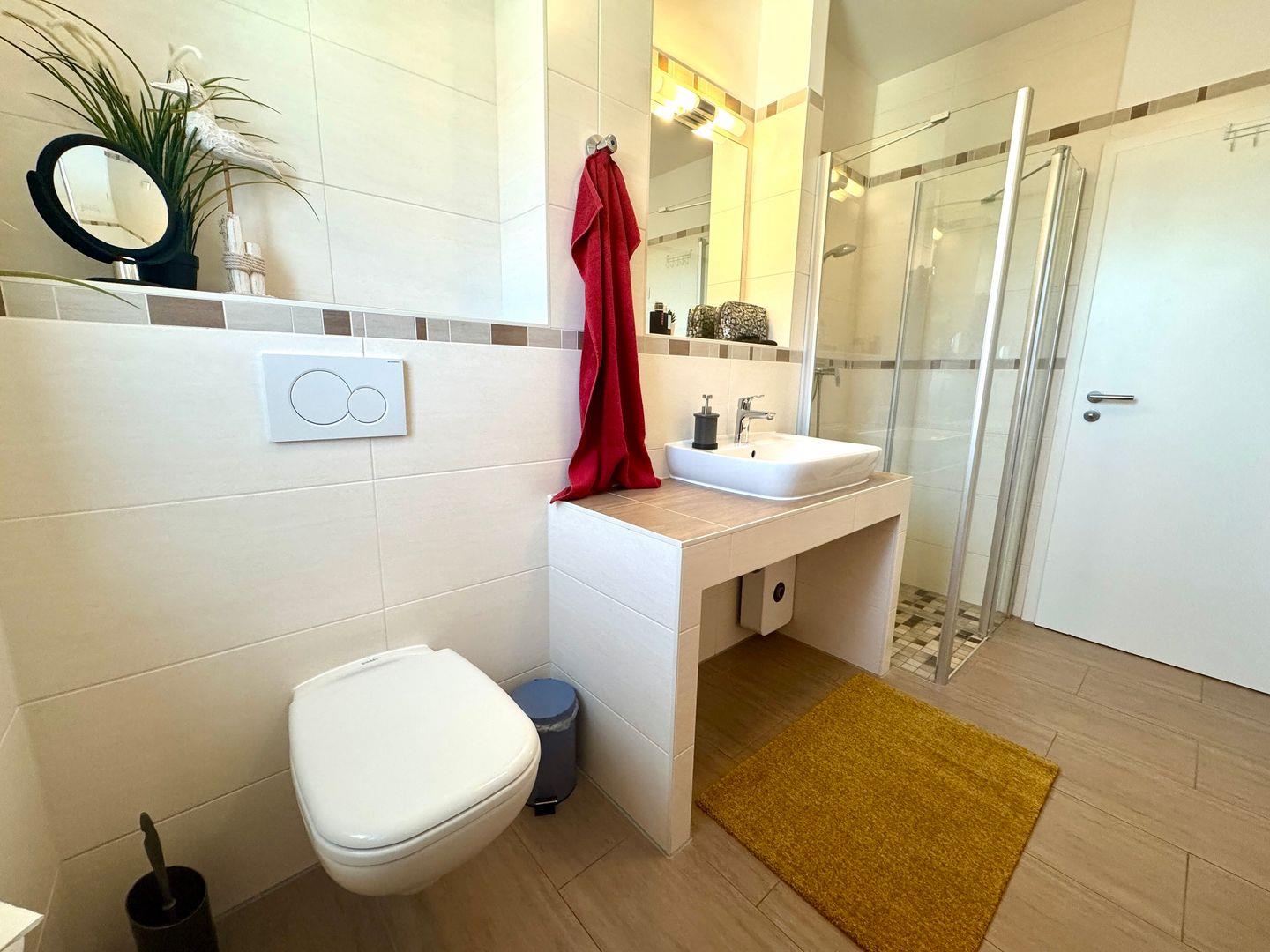 Das moderne Badezimmer überzeugt mit einer offenen Dusche, Fenster und einer klaren, zeitgemäßen Gestaltung – funktional und komfortabel zugleich.