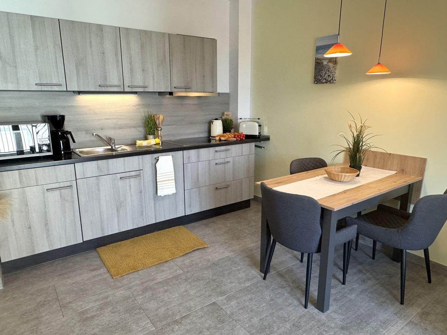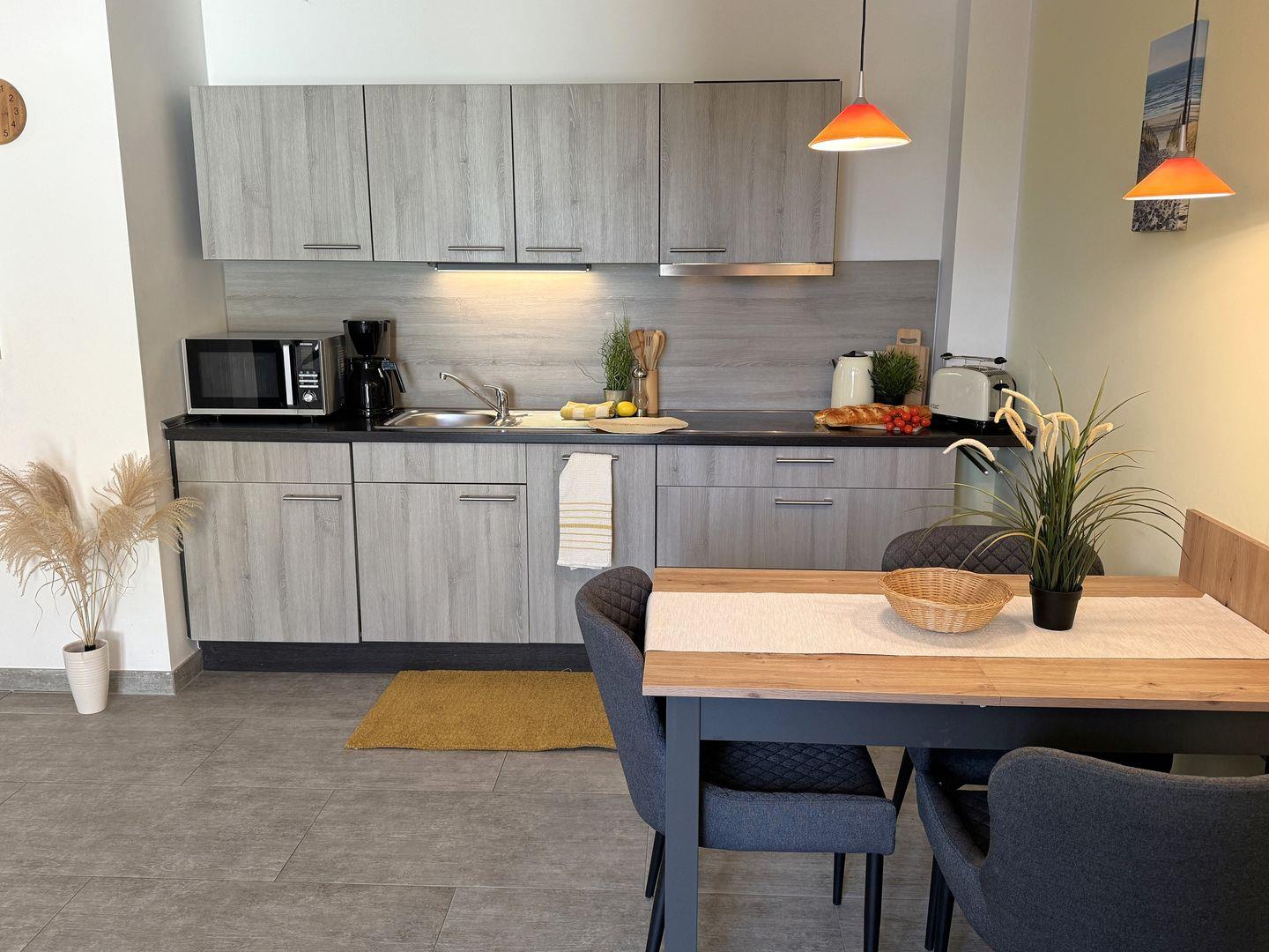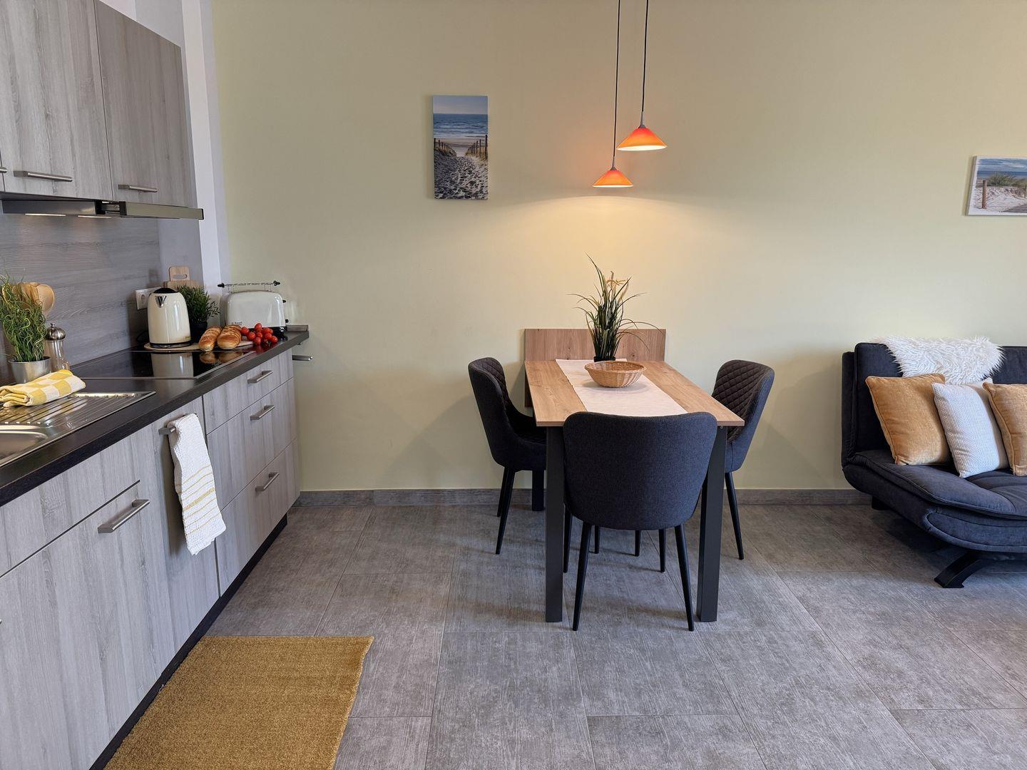 Der helle Wohnbereich mit integrierter Küchenzeile und offenem Essbereich lädt zu gemeinsamen Momenten ein. Hier können Sie den Tag entspannt beginnen, gemeinsam kochen oder den Abend gemütlich ausklingen lassen.