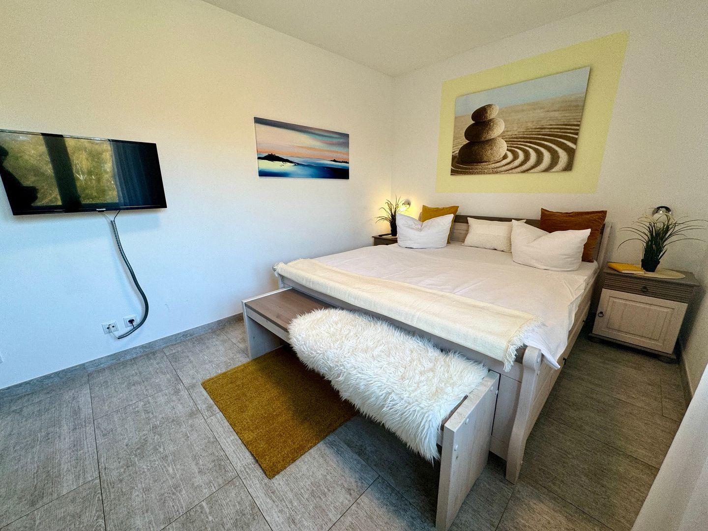 Das separate Schlafzimmer bietet einen ruhigen Rückzugsort für erholsame Nächte, während eine zusätzliche Schlafmöglichkeit im Wohnbereich Platz für eine weitere Person schafft.