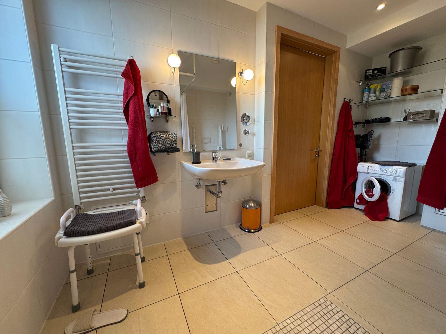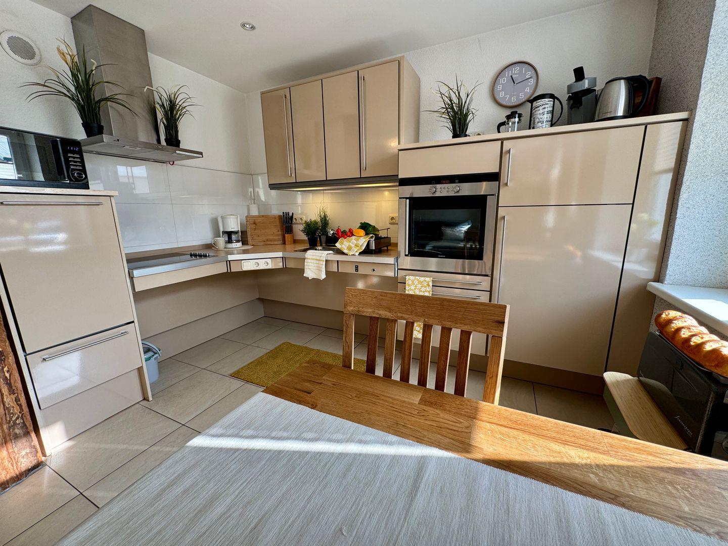 Der offen gestaltete Wohnbereich lädt mit einer gemütlichen Sofaecke, einem Kaminofen und moderner Unterhaltungstechnik zum Verweilen ein. Die barrierefreie Küche ist durchdacht eingerichtet: höhenverstellbare Arbeitsflächen, unterfahrbare Elemente und ein rollstuhlgerechter Backofen ermöglichen komfortables Kochen ohne Einschränkungen. Der Essbereich fügt sich harmonisch ein und schafft eine einladende Atmosphäre für gemeinsame Mahlzeiten.
